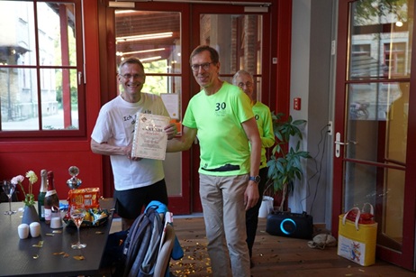 Auf der obligatorischen After-Run-Party des Lauftreffs wurde ordentlich gefeiert und Werner (2. Bild links) mit der Urkunde des 100 Marathon Clubs geehrt, überreicht durch Robert Pöttger (rechts).