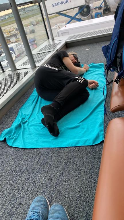 Da Doris‘ Haut etwas gelitten hatte, besorgten wir Pflegeprodukte in der Flughafen-Apotheke und aßen beim dortigen Burger King. Außerdem holten wir gleich unsere Bordkarten, die uns AirFrance (in Abstimmung mit den örtlichen Behörden) nicht online senden konnte. Als wir nach vier Stunden zum Boarden kamen, waren bereits alle Check-In-Schalter der Fluggesellschaften geschlossen. Keine Ahnung, wie man jetzt noch hätte einchecken können. So passierten wir Sicherheitscheck und die Grenzkontrolle und fanden uns mit knapp 100 Leuten im Abflugbereich. Es kamen auch nicht viel mehr, so dass quasi jeder Fluggast eine Sitzreihe im Flieger für sich allein hatte. Bei einem Nachtflug sehr angenehm, wenn man denn schlafen kann. In Paris stiegen wir um und trafen Anke und Uwe C. aus Kiel – Lauffreunde aus früheren Tagen. Nach ausführlichem Schnack flogen wir nach Hamburg. Das war die Geschichte vom schweißtreibenden und staubigen 102. (= Doris) bzw. 107. (= Mario) Länderpunkt.
