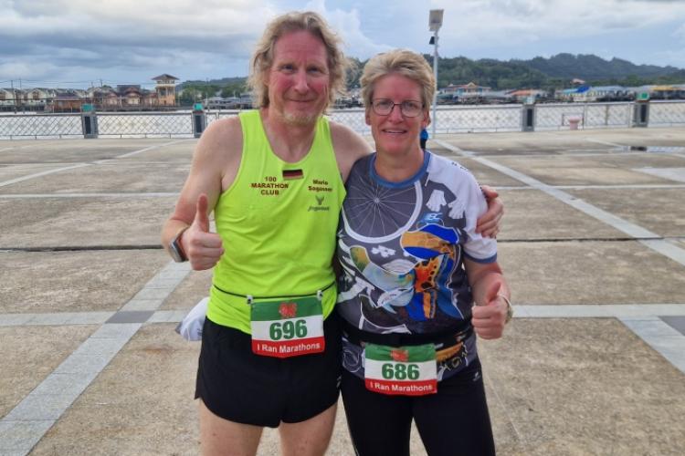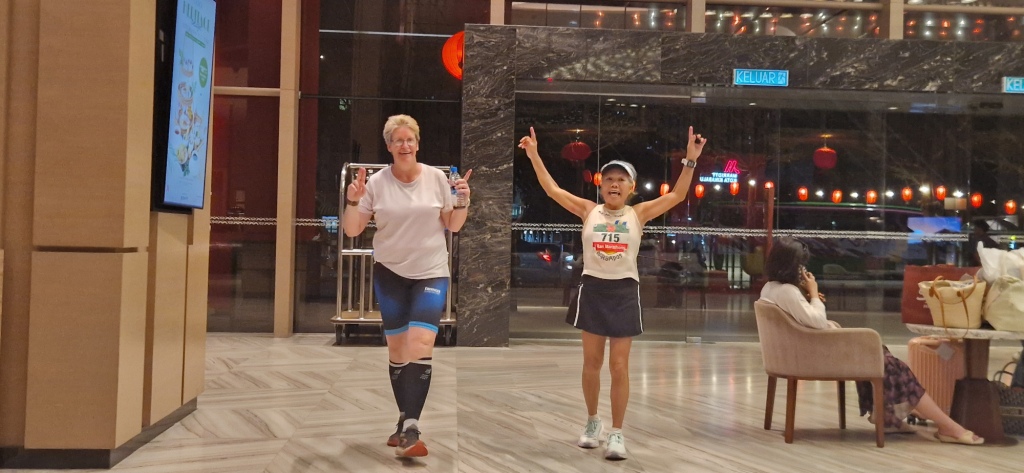 Nach dem Frühstück verabschieden wir uns von Thomas, der die Heimreise antritt. Wir fliegen nach einer Moscheebesichtigung weiter nach Kota Kinabalu, einer malaysischen Stadt, ebenfalls auf der Insel Borneo gelegen. Unser Hotel liegt direkt an der Uferstraße, gegenüber vom Veranstaltungshotel. Abendessen gabs beim großen M. Am nächsten Morgen besichtigten wir die Promenade und trafen unsere Mitläufer zum Startbriefing. Danach ging’s direkt auf die Laufstrecke und wir absolvierten die erste Runde gemeinsam zur Streckenbesichtigung. Da der Rückweg nun bekannt war, liefen jetzt alle ihr eigenes Tempo. In der Hotellobby stand wieder die Eigenverpflegung und der Ehemann einer Mitläuferin zählte die Runden. Der angekündigte Dauerregen blieb zum Glück aus, aber es war recht warm und schwül. Auch hier waren wieder viele einheimische Läufer auf der Strecke unterwegs, die oft freundlich grüßten, manchmal sogar fragten, was wir denn hier laufen. Durch große Kantensteine waren Fuß- und Radweg bestens von der Fahrbahn der Autos getrennt, so dass wir weder mit fahrenden noch parkenden Kraftfahrzeugen zu tun hatten. Über uns flogen zig Flugzeuge, die im Landeanflug auf den städtischen Flughafen waren. In der letzten Runde setzte ich dann die Stirnlampe auf, um nicht noch auf den letzten Kilometern auf Blättern oder anderen Hindernissen auszurutschen. Nach meinem Finish ging ich in unser Hotel und zog mir trockene Sportsachen an. Anschließend kaufte ich kalte Getränke, damit Doris auch auf ihren letzten Runden noch ausreichend Erfrischungen hatte. Sie lief die gesamte Strecke mit einer US-Vietnamesin. Ich saß derweil in der Lobby und erklärte ihrem Ehemann, wie der Countrymarathonclub funktioniert und wie man sich dort anmeldet.