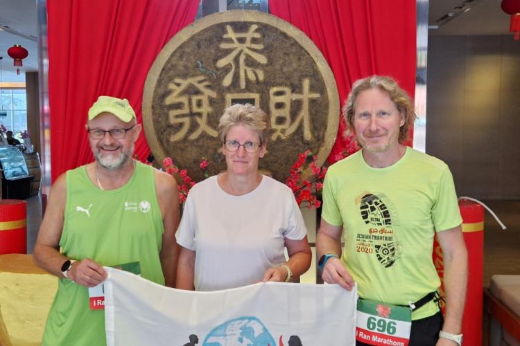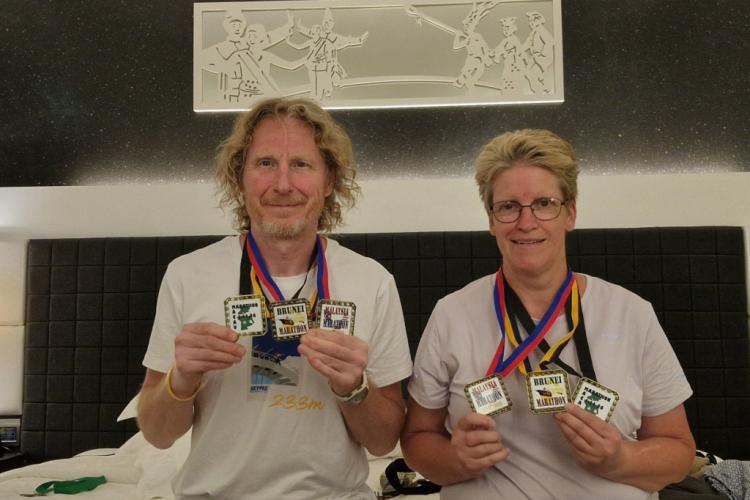 Dafür lief es bei der Ankunft in Hong Kong reibungslos, denn wir fanden einen Minibus, der uns über die 52 Kilometer lange Brücke nach Macau brachte. So brauchten wir nur noch ein Taxi zum Hotel in Macau, das an einer Bucht am Südchinesischen Meer liegt. Das Hotel war prima und wir erholten uns von der Reise. Beim Frühstück am nächsten Morgen trafen wir den Finnen Peter und Anton aus Österreich, beides Ländersammler wie wir, die für die nächsten Tage unsere Reisekollegen sein würden. Gemeinsam fuhren wir zur Startbesprechung ins Stadtzentrum, denn der Lauf sollte im Casino-Viertel stattfinden. Dort gab es herzliche Begrüßungen mit den bekannten Läufern (aus USA; Iran und Dänemark) und neue Freundschaften wurden geschlossen. Nach der Besprechung kauften wir unsere Getränke für den Lauf ein, der am späten Abend starten sollte. Im Hotel warteten wir auf Thomas und nach seiner Ankunft gings per Taxi zum Start. Wir stellten unsere Flaschen in der Hotellobby ab, wo die Freundin vom dänischen Lauffreund Klaus darüber wachte und die Runden zählte. Gemeinsam marschierten wir durch das nächtliche Macau. Anfangs trafen wir noch Konzertbesucher, die aus einer Arena zu den Bussen und UBER-Taxis strömten. Später waren nur noch unsere Mitläufer und ein paar streunende Hunde unterwegs. Zwischendurch hörte ich per Internet-Radio noch die Endphase vom HSV-Spiel, denn in Deutschland war es erst nachmittags. Da überall Kameras hingen, bevorzugten wir die Hotel-WCs, um kein öffentliches Ärgernis zu erregen. Außerdem begeisterte fließend Wasser, Seifenspender und Papierhandtücher, den erprobten Teilnehmer an DIY-Marathons. Als wir nach 21 Runden fertig waren, bekamen wir von der Veranstalterin unsere Medaillen und fuhren frühmorgens – und ziemlich übernächtigt - zurück ins Hotel. Wir konnten ausschlafen, während Thomas und die anderen bereits auf dem Sprung zur Weiterreise nach Taiwan waren. Abends aßen wir in einem Strandrestaurant Hummer und packten dann unsere Koffer, weil wir am nächsten Tag nach Brunei fliegen sollten. Den Kontakt zur Heimat, denn dort sollte ja laut Wettervorhersage eine Schneekatastrophe über Schleswig-Holstein einbrechen, hielten wir per Außenkamera (Schneelage!), Whatsapp, Schleswig-Holstein-Magazin in der ARD-Mediathek und der Online-Ausgabe des Hamburger Abendblatts. Die Weiterreise startete mit dem Hotelshuttlebus zum Ausreiseterminal in Macau und von dort mit dem Flughafenbus nach Hong Kong Flughafen. Von dem Fahrpreis bekamen wir in Hong Kong sogar noch 2/3 zurückgezahlt, weil es sich um eine erstattbare Flughafengebühr handelt. Wir stellten erfreut fest, dass sich die Strapazen und der Stress, um von Hong Kong nach Macau und zurück zu kommen, seit unserer Reise im März 2024 gewaltig reduziert hatten.