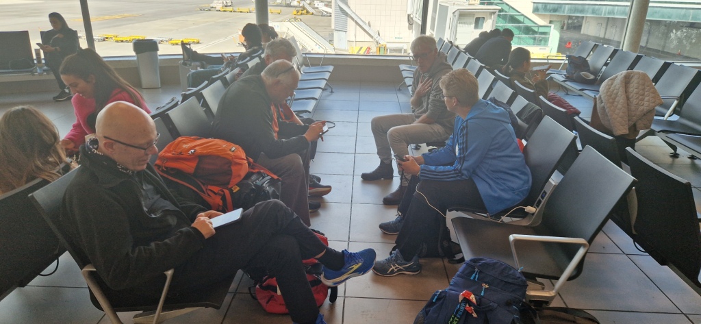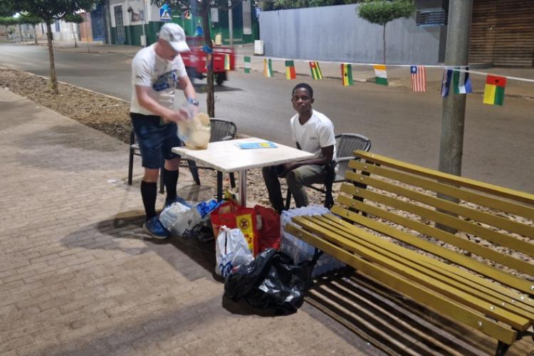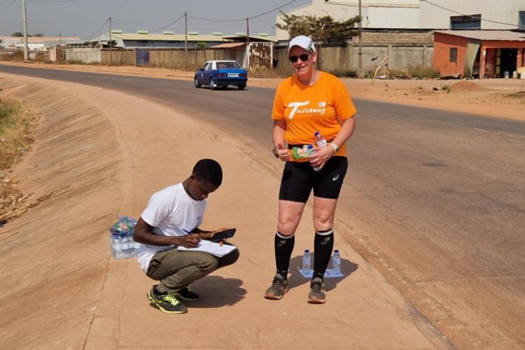 Unsere nigerianische Lauffreundin Dayo hatte die Idee, dass eine gemeinsame Medaille für die 4 Guineas: Guinea, Guinea-Bissau, Äquatorial-Guinea und Neu-Guinea eine coole Idee wäre. Darum hatte sie zum G2G (Guinea-Bissau und Guinea) aufgerufen. Wir folgten ihrem Ruf, wie noch 12 weitere Läufer und Läuferinnen. Da wir für Bissau eine Einladung benötigten, hat sie uns mit ihrem Kontakt zur örtlichen Tourismusbüro geholfen, so dass wir mit diesen Schreiben ausgestattet, die Reise antreten konnten. Das erste große Hallo gab es bereits in Lissabon, wo sich bereits 8 Läufer auf dem Flughafen trafen, um mit der portugiesischen TAP nach Bissau weiterzufliegen. Denn Guinea-Bissau war bis in die 60er Jahre eine Kolonie Portugals. In Bissau angekommen, holte uns Dayo mit einem Kleinbus ab und wir fuhren in das sehr zentral im Regierungsviertel gelegene Hotel. Da es schon später Abend war, rannten Thomas und ich sofort zum Supermarkt, um Getränke für den morgen früh angesetzten Lauf einzukaufen. Doris checkte derweil im Hotel ein und lauschte der Startbesprechung. Dort traf sie auf die restlichen Teilnehmer und Dayos Ehemann Gary, der bei der Reise und den Läufen unterstützte.