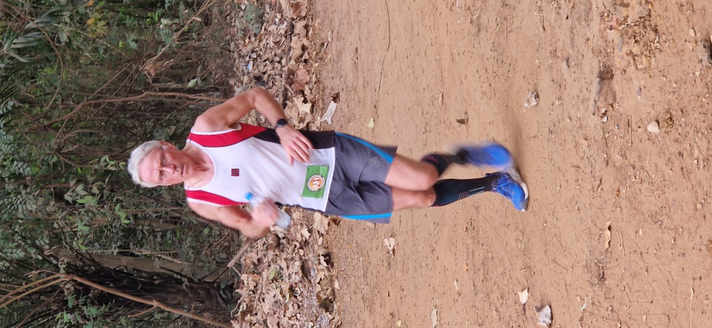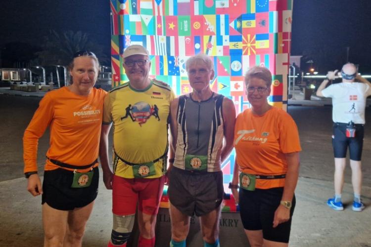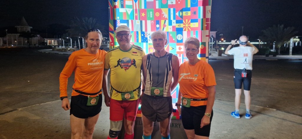 Perfekt durch Dayo vorbereitet, bekamen wir schon um 4 Uhr Hotelfrühstück. Danach stellten wir unsere Verpflegung und Kleidertaschen (mit Stirnlampen, Sonnenbrillen, Laufkappen, etc) auf den Tisch auf den breiten Promenadenbürgersteig (gepflastert!) direkt vor dem Hoteleingang ab. Dann liefen wir 20 Meter zum Heldenplatz, an dem wir nach den obligatorischen Fotos starten. Zuerst liefen wir 6 Runden am Hotel auf und ab und danach – als die Dämmerung langsam einsetzte – in Richtung Industriehafen. Ebenfalls 6 Runden als Begegnungsstrecke. Dadurch sah man die Mitläufer und konnten sich gegenseitig motivieren, denn zum späten Vormittag kratzte das Thermometer bereits an der 30°C-Marke. Und da waren noch lange nicht alle fertig. Dayo hatte die Streckenposten sehr gut eingewiesen, denn an allen relevanten Abzweigern stand jemand und zeigte den Weg an. Außerdem waren die Verpflegungsstände bis zum Ende besetzt und es wurden Wasser und Bananen gereicht.