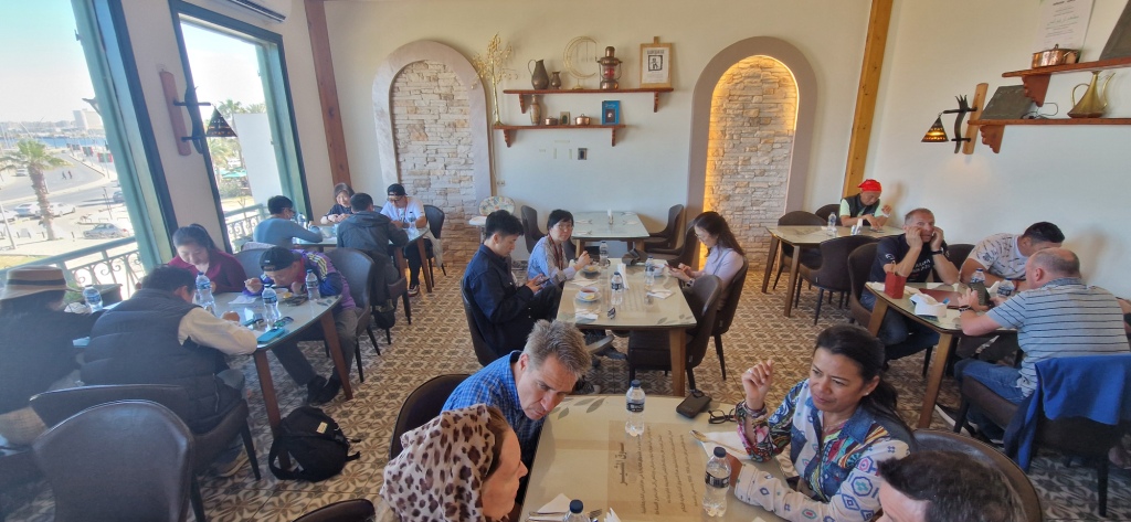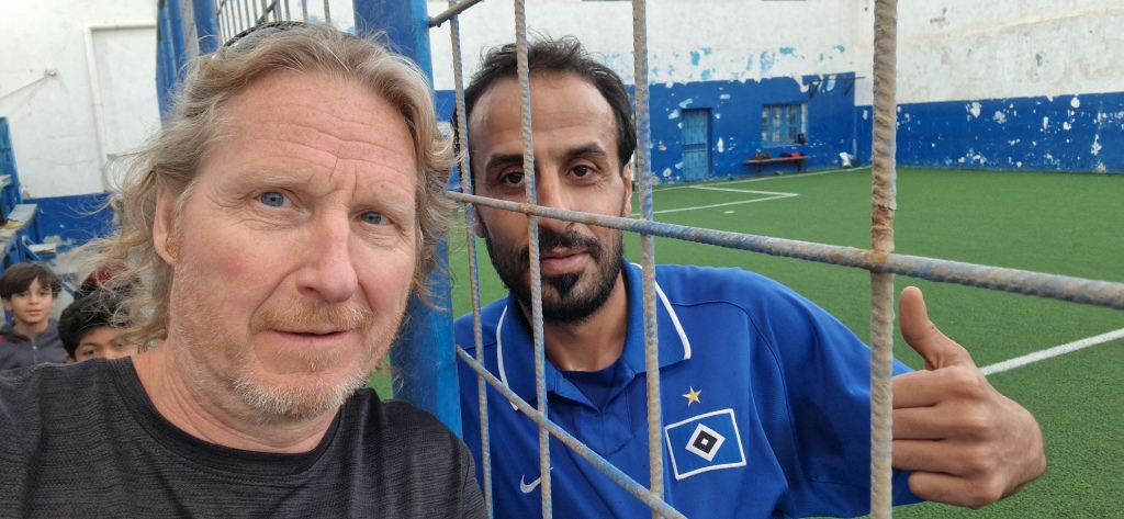 Am nächsten Morgen verließen wir leider diesen herrlichen Ort und besuchten das historische Museum über die Römerzeit in Libyen. Mittagessen in einem (wahrscheinlich besonderen) Restaurant in Tripolis, nur waren die Kellner mit unseren Bestellungen etwas überfordert. Die wurde zwar vom Oberkellner mit dem Dolmetscher aufgenommen, jedoch erfolgte die Auslieferung durch andere Kellner, was bei 50 Gästen (von denen nur 4 arabisch sprechen) schief gehen kann. Nach dem Einchecken im Hotel, das leider nicht annähernd die Qualität des ersten hatte, fuhren wir in die Altstadt zum Stadtrundgang. Einige Schülerinnen feierten ihren Schulabschluss mit Talar, Absolventenhut, Scherpe und großem Blumenstrauß. Wir kauften Kleinigkeiten, tranken Kaffee. Kurz vor Ende der Zone, die wir nun frei erkunden durften, hörte ich auf einem Innenhof charakteristische Fussballgeräusche. Richtig, hier bolzten sie 4 gegen 4 in einem Käfig auf Kunstrasen. Meine Begeisterung war perfekt, da der begnadetste Spieler ein HSV-Trikot trug. In einer Pause zeigte ich ihm meine Brust. Da lächelte er und sagte „Hamburg“. Nun lächelte auch ich. Es ging zum Abschlussessen in ein italienisches Restaurant. Die hatten es besser drauf, brachten fertige Platten an die Tische und platzierten die Vegetarier an einem gesonderten Tisch. Nun hieß es Abschied nehmen von der halben Truppe, die am nächsten Tag nicht über Istanbul zurückreisen wollte.