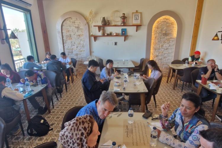 Nach der Landung kostete uns die Immigration 2 Stunden Wartezeit, trotz Unterstützung des lokalen Reiseleiters. Endlich im offenen Teil des Flughafens angekommen, wechselten wir viel zu viel Geld und kauften spottbillige SIM-Karten. Dann kamen die Begleiter der Tourismuspolizei dazu und wir fuhren in Kleinbussen gen Osten, aber nur einige Kilometer, um in einem kantinenartigen Restaurant Mittag zu essen. Sehr lecker und - was selten vorkommt - die Vegetarier durften als Erste ans Buffet. Nach dem sehr leckeren Essen ging’s weiter in Richtung Leptis Magna, einer alten römischen Stadt. Wir bezogen ein Ferienressort, dass sich problemlos mit 5-Sterne-Ferienanlagen auf Mallorca oder anderen europäischen Urlaubsregionen messen konnte. Durch den Ausfall von Doris war nicht geklärt, ob ich im Doppelzimmer bleiben könnte, ein Einzelzimmer bekäme oder einen Zimmerpartner. Ich bekam einen Zimmerschlüssel für mich allein, öffnete die Tür und bekam den Mund nicht wieder zu: 3 Schlafzimmer, 2 Badezimmer, 1 Wohnzimmer, 1 Esszimmer mit Küchenzeile, 1 Balkon und eine eigene innenliegende Terrasse mit kleinem Pool - nur für mich. Die anderen wohnten genauso exklusiv. Nach einem kurzen Besuch am Strand war Abendessen, im gleichem Niveau, nicht arabisch oder afrikanisch. Anschließend war das Briefing für den Lauf am nächsten Morgen, Vorstellung der örtlichen Reiseleiter und den sportlich Verantwortlichen (aus dem Sportministerium). Laut örtlichem Reiseleiter sind wir die größte Reisegruppe im Land seit der Revolution 2011. Jetzt konnten sich die Läufer intensiver austauschen - nicht nur mit dem Sitznachbarn im Flieger, Kleinbus oder Restaurant. Trotzdem freute ich mich aufs Bett nach der nicht ganz so erholsamen Nacht auf dem Istanbuler Flughafen.