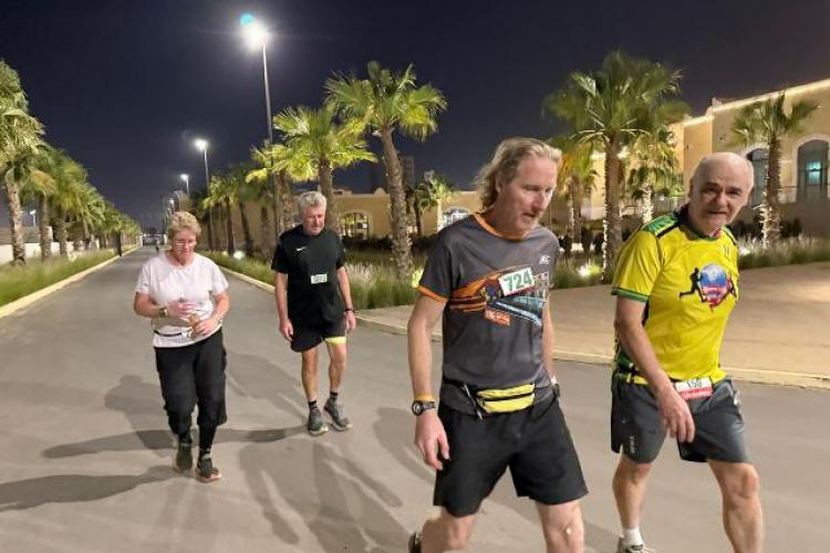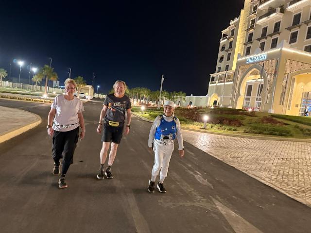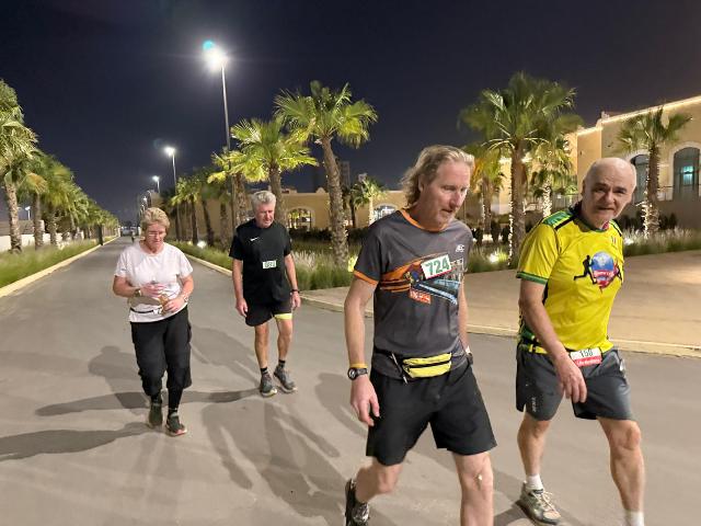 So starteten wir um 18 Uhr abends und marschierten mit 9 weiteren Teilnehmern vom Abend in die Nacht. Da uns das Sheraton freundlicherweise unterstützte und das Gelände zur Verfügung stellte, war die Strecke gut beleuchtet, mit sehr guter asphaltierter Oberfläche und wir konnten sogar die Toiletten in der Lobby oder im Pool-Bereich nutzen. Durch unser langsameres Tempo kam es zu einigen Überrundungen, die sich mit der Zeit reduzierten. Beim Überholen wurde immer wieder kurz geschnackt, so dass es trotz der Dauer ein kurzweiliger Lauf bei sommerlichen Abendtemperaturen war.