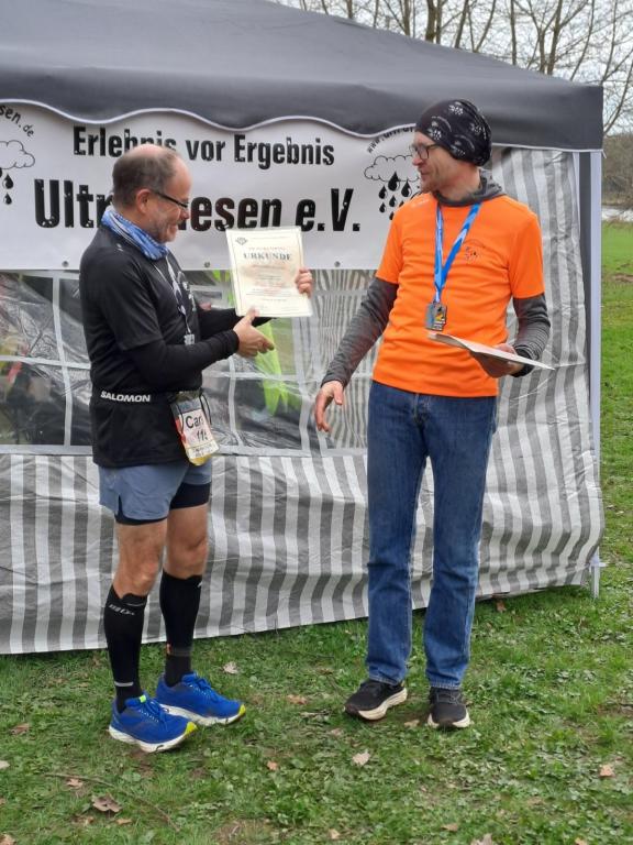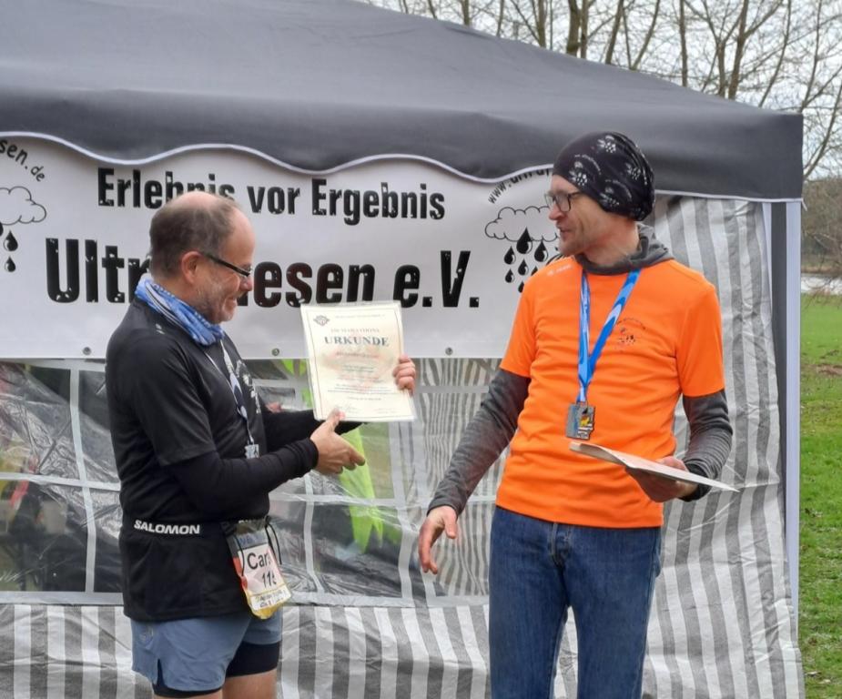 Die Urkunde für seinen 250. Lauf sowie die Auszeichnung durch den 100 Marathon Club wurde nach dem Wettkampf von Vereinsmitglied Carsten Nuhn überreicht – direkt am Werdersee, in Sichtweite des Weserstadions, vor dem Zelt der Ultrafriesen. Alexander und Carsten sind beide ebenfalls aktive Mitglieder des im Nordwesten Deutschlands stark vertretenen Laufvereins.