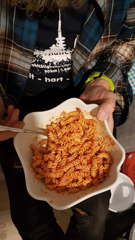 Also weiter! Auch mental ist der Entsafter anspruchsvoll. Wenn man sich entscheidet, nach der Marathondistanz weiterzulaufen, ist man für die nächsten 21 km weit ab jeglicher Zivilisation und Straßen. Es geht nur vor oder zurück! Also weiter! Auf recht ebener Strecke mit nur leichten Steigungen, oft parallel zur Südharzloipe (also dem Weg, der als Südharzloipe gespurt werden kann. Aber Schnee ist ja dieses Jahr nicht da). Ich will nur noch aus diesem Entsafter raus, so schnell wie möglich! Nur das hält mich noch am laufen. Endlich VP6 Lausebuche, die warme Brühe tut so gut! Hier habe ich 63,1 km in den Turmschuhen und bin mir jetzt sicher, den Rest schaffe ich auch noch!