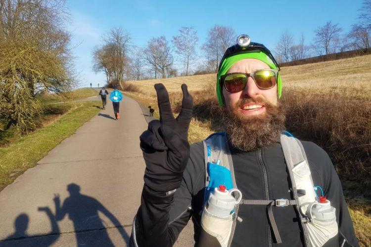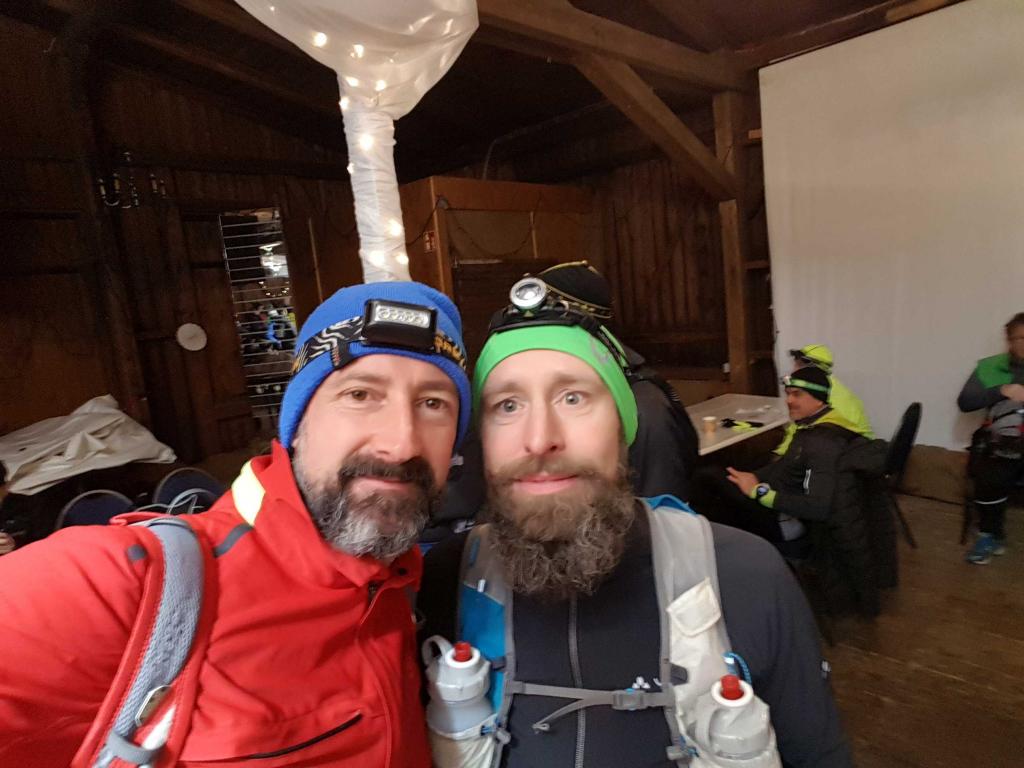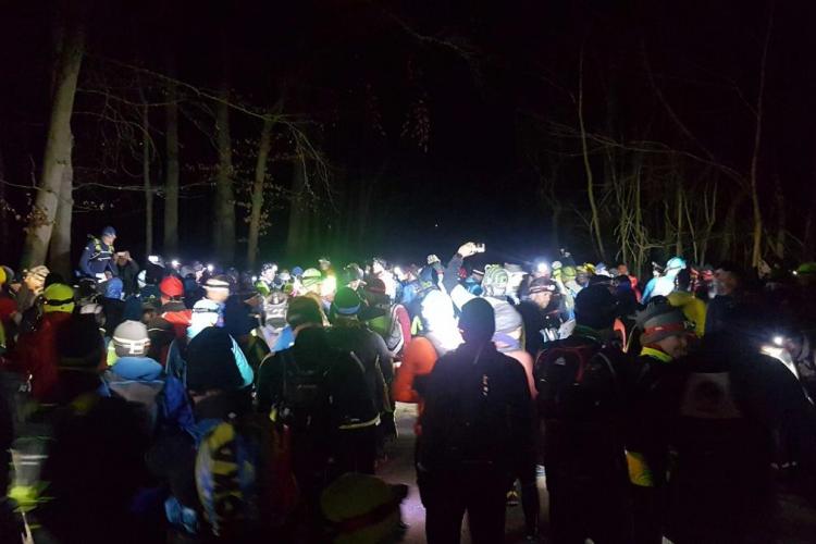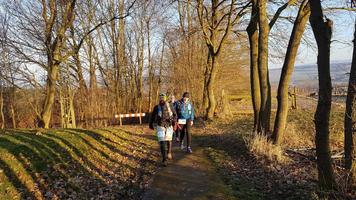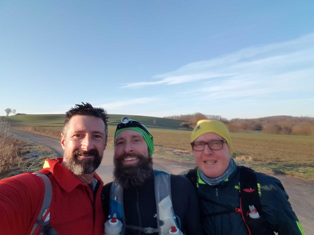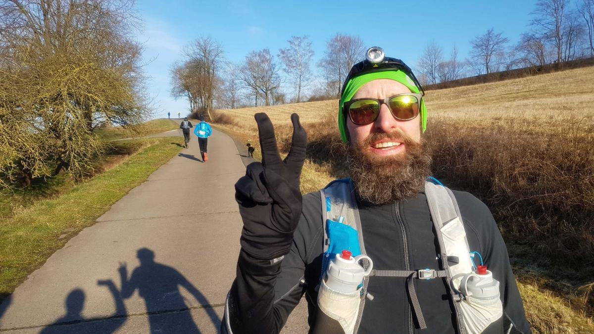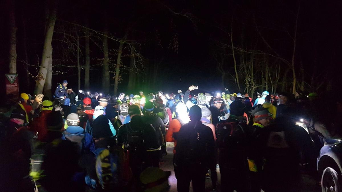 Oberhalb Göttingens am Kehr muss man sich vor dem Start in die Starterliste eintragen. Im alten Tanzsaal gibt es ein grandioses Frühstück mit allem was das Herz begehrt. Und das noch fast komplett (wie auch an allen Verpflegungspunkten) in Bioqualität. Alles lecker und liebevoll zubereitet und angerichtet. Kurz vor sechs, alle raus in die Kälte und das große Gewusel am Start beginnt. Durch die unzähligen Stirnlampen und Reflektoren auch ein beeindruckendes Bild. Die Challenge wird mit dem alten BC Schlachtruf: 'Here We Go!' gestartet. Die ersten Kilometer geht’s durch den mit Fackeln am Wegesrand beleuchteten Göttinger Stadtwald. Den völlig ausgestorben wirkenden Ort Mackenrode passieren wir morgens gegen halb sieben. Nach etwa einer weiteren halben Stunde erreichen wir den VP1 bei Kilometer 10,9 in Landolfshausen. Zeit für ein zweites Frühstück. Der Vollmond geht so langsam unter. Es ist immer noch knackig, einige Grad unter Null. Meine Haare sind fest gefroren.
