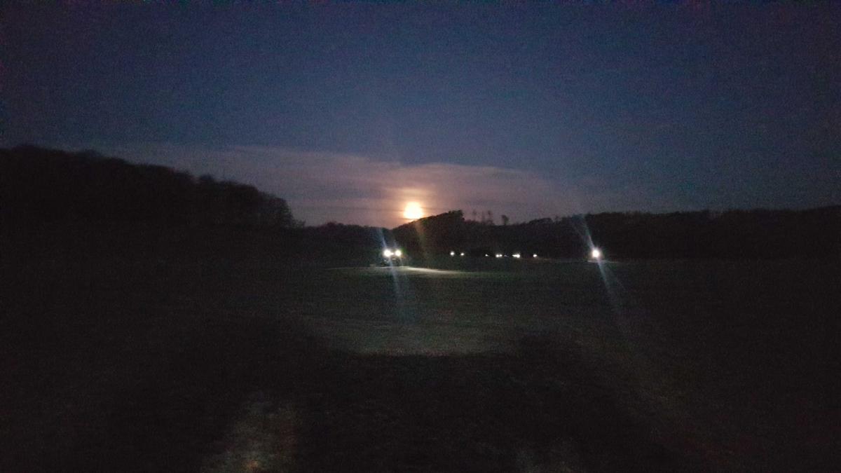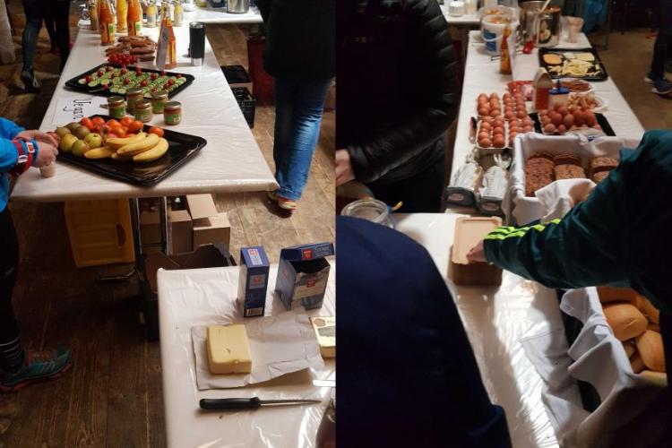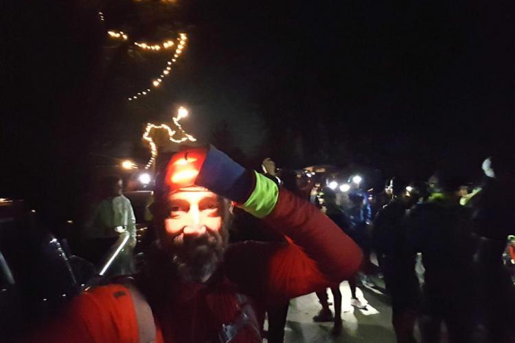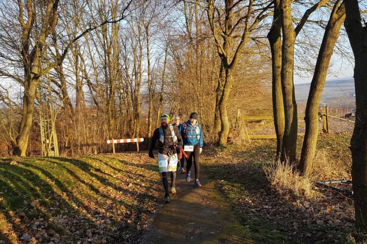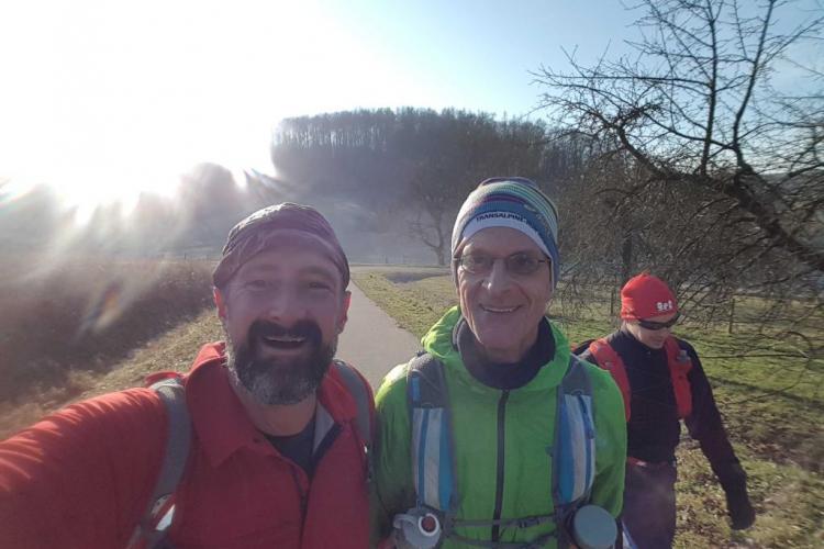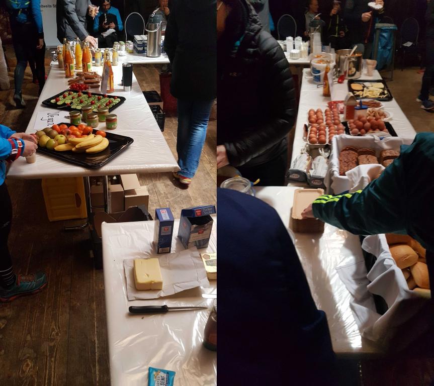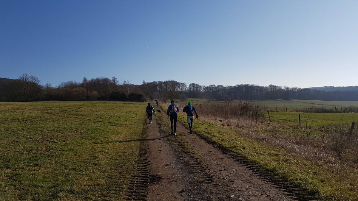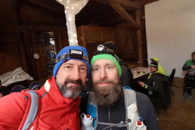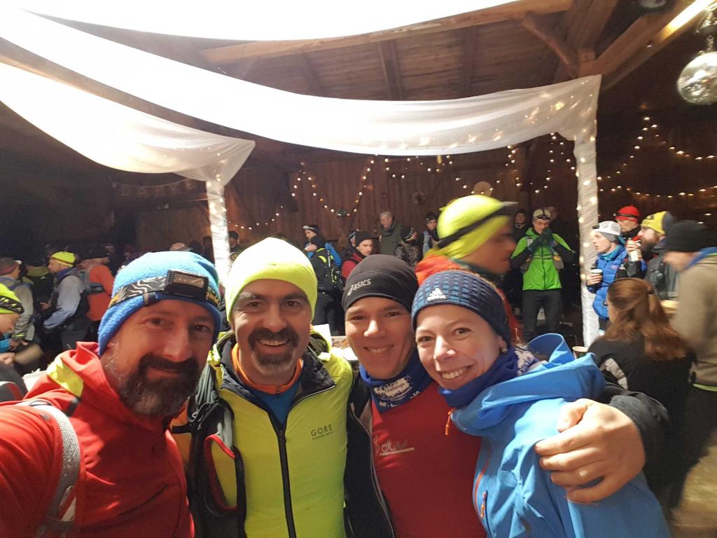 Oberhalb Göttingens am Kehr muss man sich vor dem Start in die Starterliste eintragen. Im alten Tanzsaal gibt es ein grandioses Frühstück mit allem was das Herz begehrt. Und das noch fast komplett (wie auch an allen Verpflegungspunkten) in Bioqualität. Alles lecker und liebevoll zubereitet und angerichtet. Kurz vor sechs, alle raus in die Kälte und das große Gewusel am Start beginnt. Durch die unzähligen Stirnlampen und Reflektoren auch ein beeindruckendes Bild. Die Challenge wird mit dem alten BC Schlachtruf: 'Here We Go!' gestartet. Die ersten Kilometer geht’s durch den mit Fackeln am Wegesrand beleuchteten Göttinger Stadtwald. Den völlig ausgestorben wirkenden Ort Mackenrode passieren wir morgens gegen halb sieben. Nach etwa einer weiteren halben Stunde erreichen wir den VP1 bei Kilometer 10,9 in Landolfshausen. Zeit für ein zweites Frühstück. Der Vollmond geht so langsam unter. Es ist immer noch knackig, einige Grad unter Null. Meine Haare sind fest gefroren.