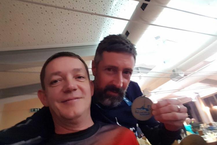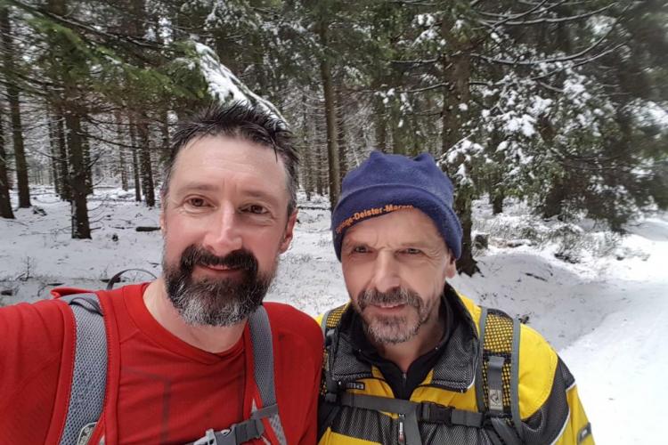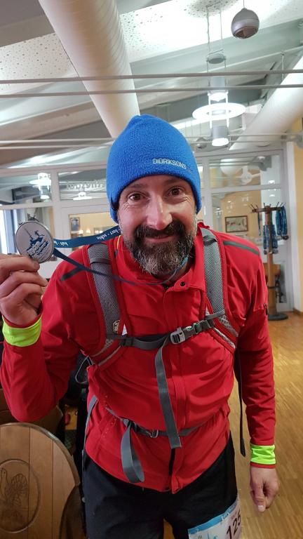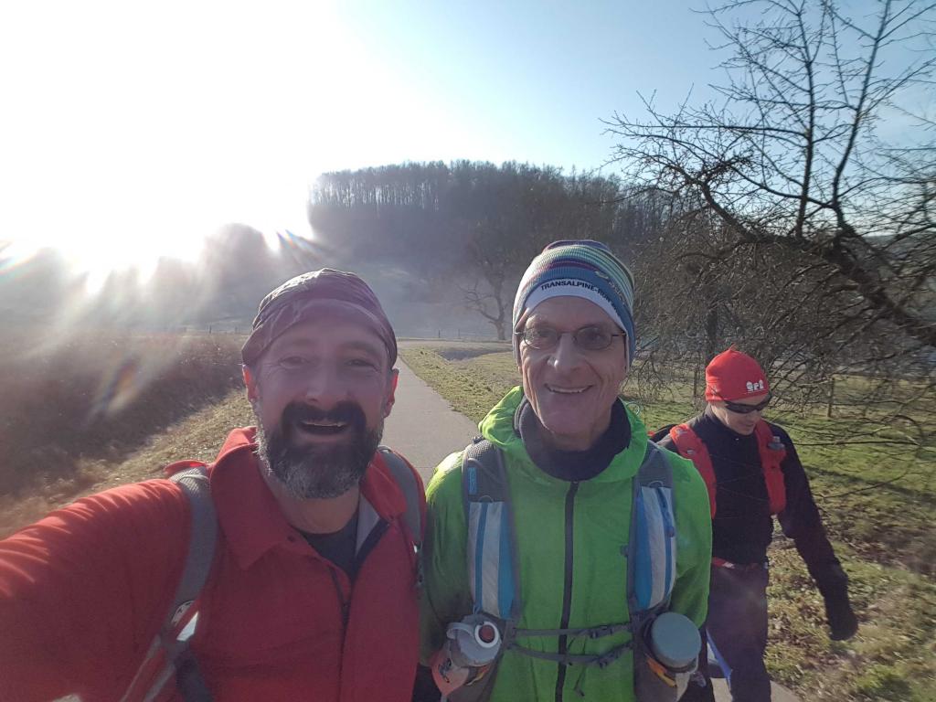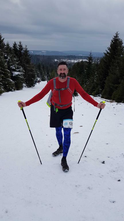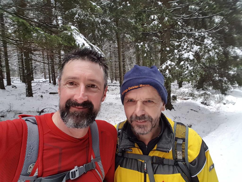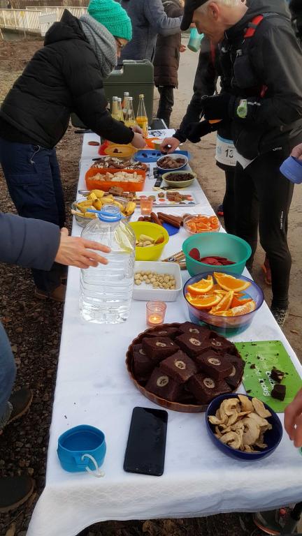 Apropos Turnschuh- / Laufschuhwahl: Viele von uns haben ja einiges an Tretern im Schrank oder vor der Tür stehen. Ist bei mir genauso. Vor so einem Lauf habe ich mir mir natürlich unter Berücksichtigung der Kriterien, Streckenlänge, Untergrund, Wetter, insbesondere Schnee-Regen-Matsch, Gedanken gemacht und mich für das Paar wasserdichte, grobstollige Trailschuhe entschieden. War allerdings rückblickend nicht die optimale Wahl. Harte Wege, Asphalt und wenig Matsch, dazu haben die Trailschuhe zu wenig Dämpfung und sind zu hart. Im oberen Bereich, im Schnee haben sie schon Sinn gemacht. Ich muss sie allerdings so fest anknallen, damit sie nicht scheuern, dass ich schon nach einigen Kilometern höllische Schmerzen im oberen Mittelfuß habe. Selbst nach zweimaligem lockern der Schnürsenkel lassen die Schmerzen nur dezent nach, so dass ich mir schon Gedanken mache, ob es evtl. ein Ermüdungsbruch ist. Aber, wir wissen ja, Schmerzen kann man auch weglaufen. Also weiter und nicht mehr dran denken!