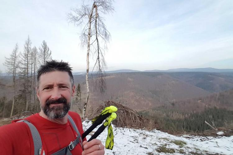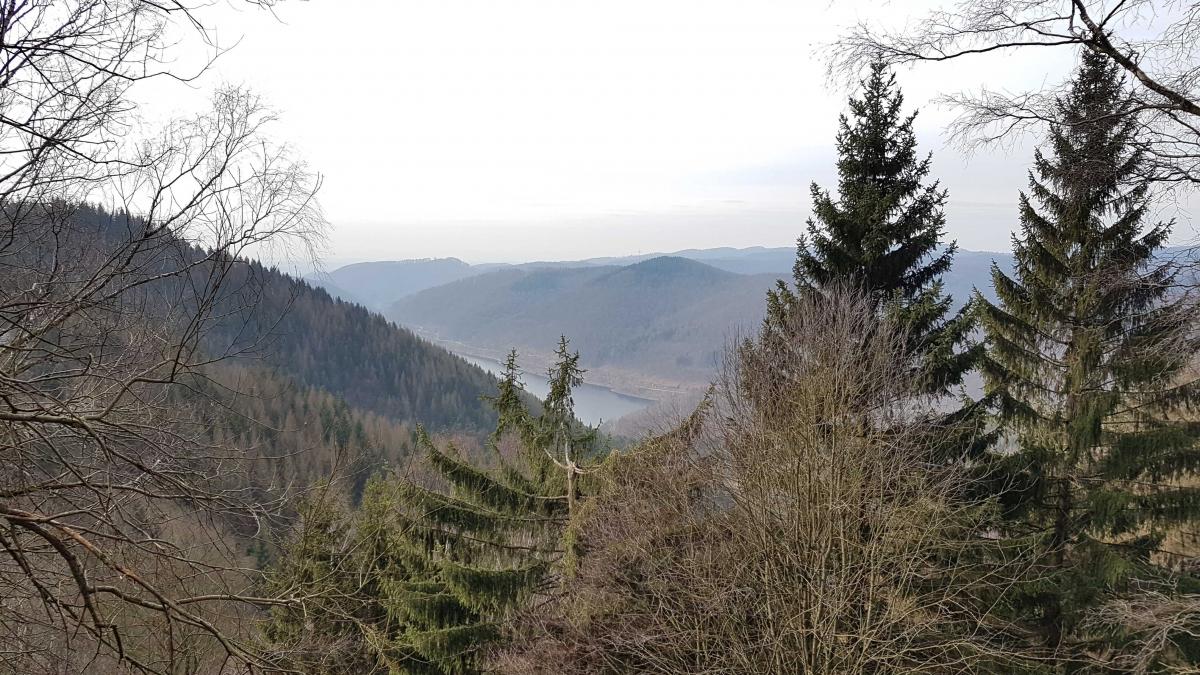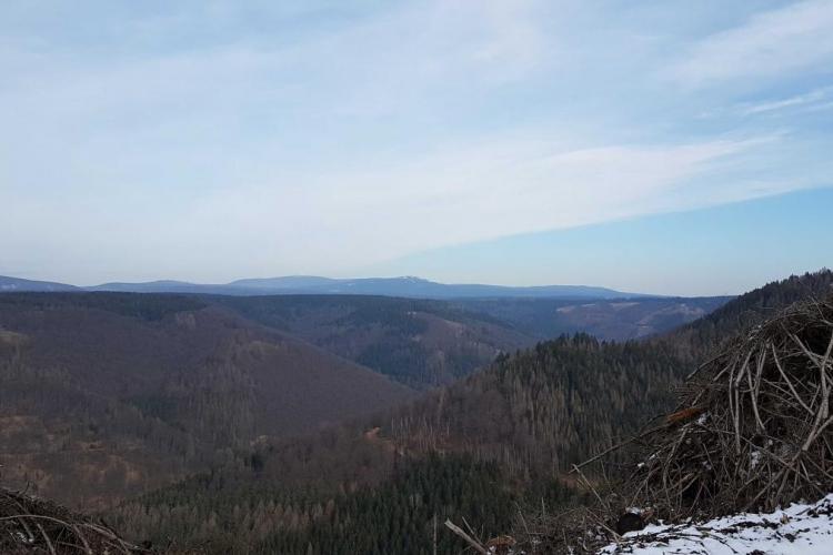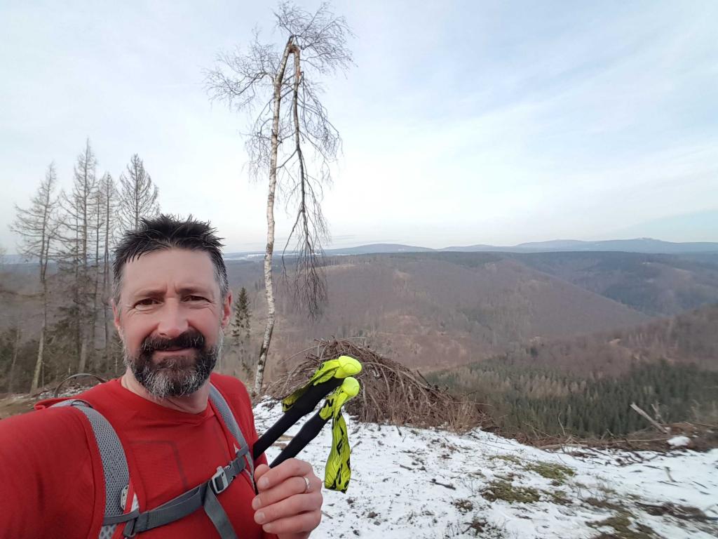 Die nächsten 21,6 km werden als Entsafter bezeichnet. Er saugt den Läufern sämtliche Kraft aus dem Körper. Außerdem schwitze ich wie ein Hund. Direkt hinter der Verpflegung geht es mal wieder steil bergan, oben angekommen ist man endlich richtig im Harz! Erst ein paar Kurven auf Waldwegen, dann die Weser - Elbe Wasserscheide. Daran anschließend, über etliche Kilometer im Steinaer Tal immer weiter bergauf, insgesamt 400 Höhenmeter. In dieses abgelegene, enge Tal scheint im Winter wohl nie die Sonne. Es ist unangenehm kalt! Oben auf dem Jagdkopf, auf 635 m Höhe angekommen, erwartet mich der Notverpflegungspunkt VP5. Die angereichten Stöcke haben mit hier schon gute Dienste geleistet. Immerhin schon 53,8 km auf der Habenseite, aber noch lange nicht durch den Entsafter!