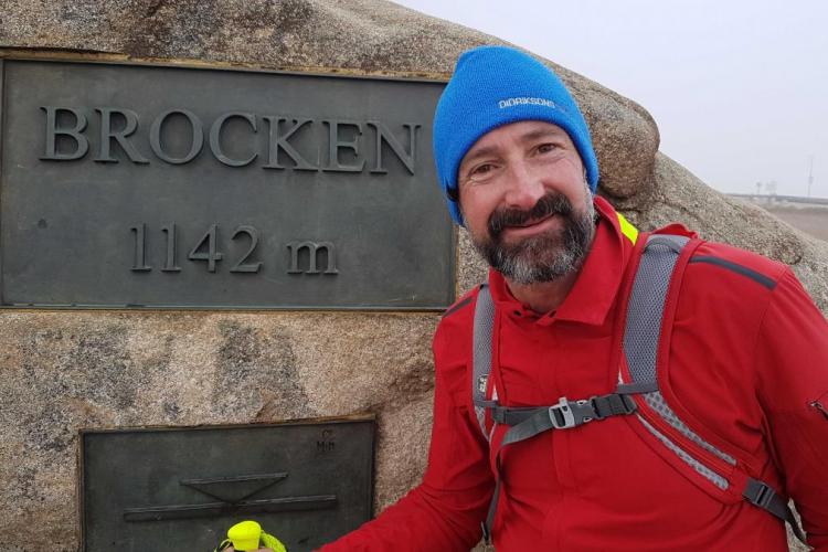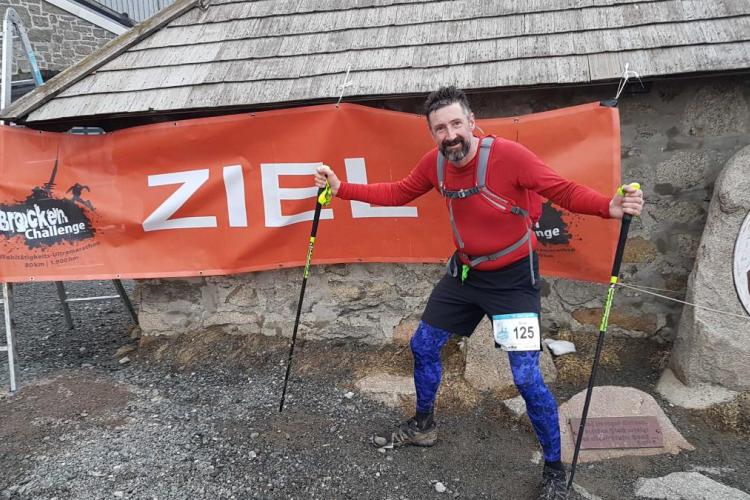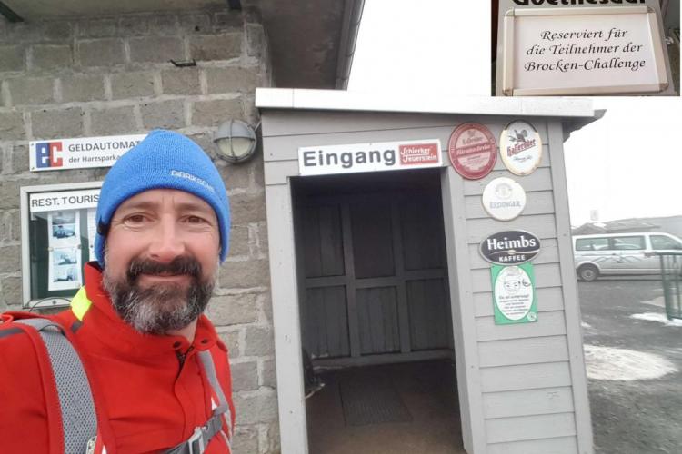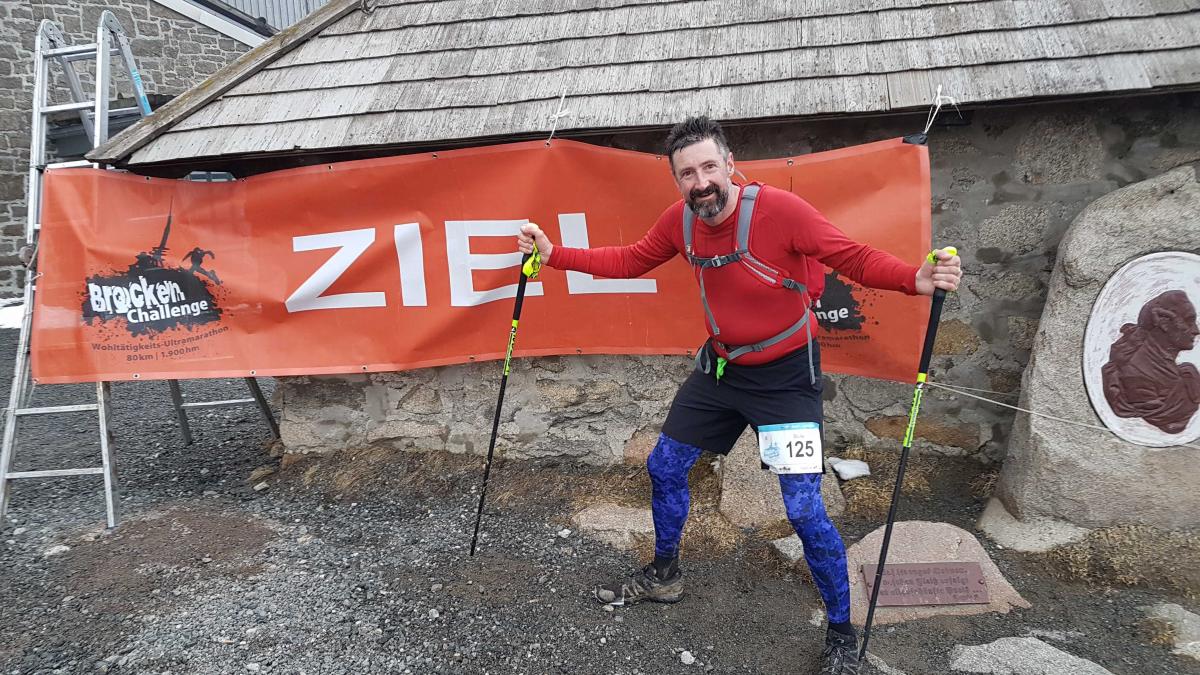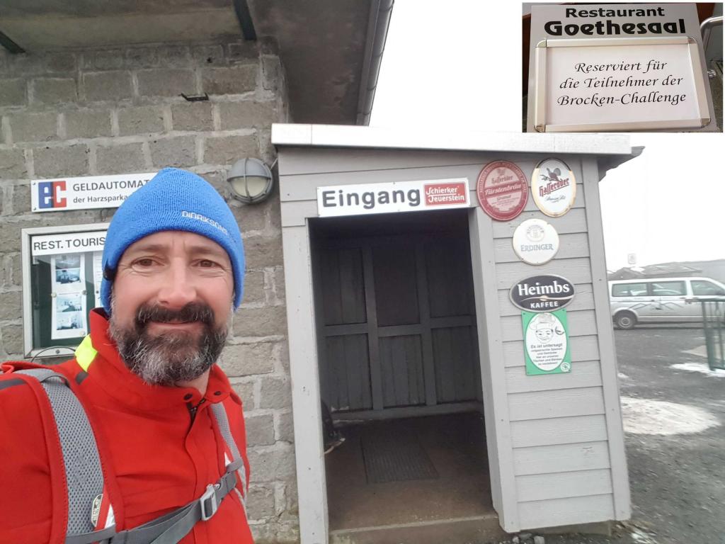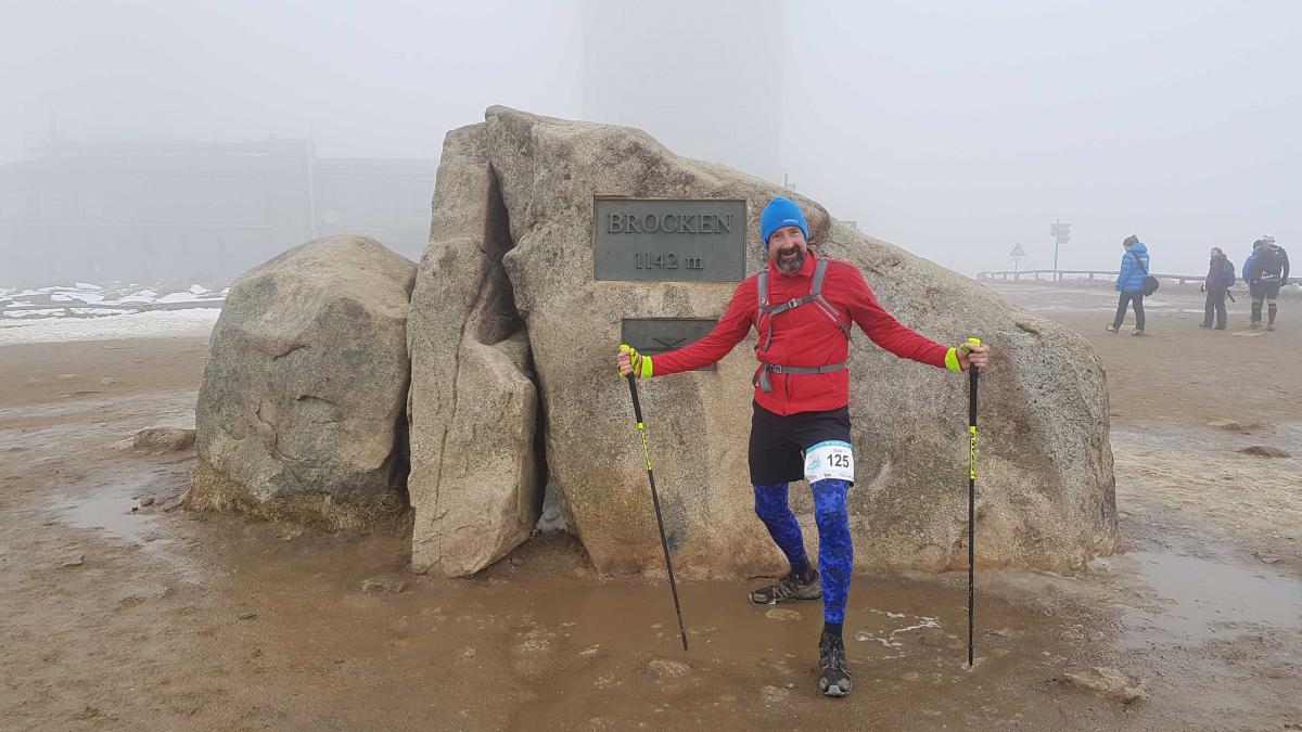 Dann der Brockenanstieg selber. Noch mal 370 Höhenmeter rauf! Erst langsam ansteigend, dann die Rampe hoch! Steil! Ab hier wird es auch richtig ungemütlich, ordentlich Wind, Feuchtigkeit in der Luft und Kälte – Alles was man nicht braucht! Danach den Wanderweg dicht am Gleis der Brockenbahn. Dann noch links auf die Brockenstraße abgebogen, zwei letzte Kurven und schon bin ich im Ziel! Dort werde ich begeistert von den Helfern empfangen und bekommt meine Medaille. 80 km sind abgerissen! Noch kurz zum Brockenstein ein Foto machen und dann aber rein zum Brockenwirt. Beim Brockenwirt bekomme ich meinen Rücksack mit den Wechselsachen, kann mich duschen und aufwärmen. Ein fantastisches Buffet ist inclusive!