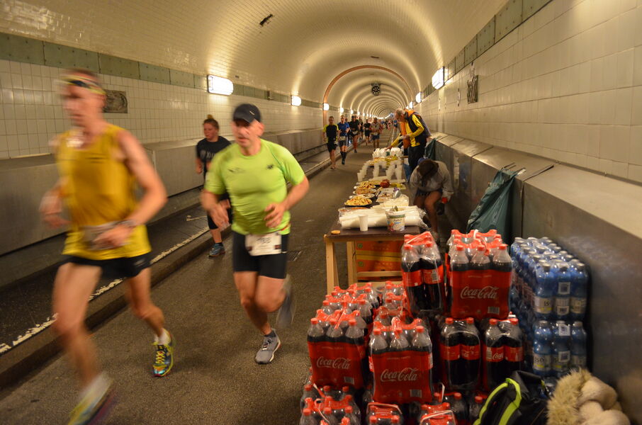 Ingesamt wurden über 50 freiwillige, ehrenamtliche Helfer geworben. Teilweise Läufer, die vor oder nach ihrem Marathon mit angepackt haben, aber auch 30 Freunde des Laufsports, die ihren Sonntag (und das war der bisher schönste und wärmste Tag des ganzen Jahres) im Tunnel verbracht haben, damit wir laufen können. Neben den bekannten Jobs wie Verpflegung und Zeitnahme mussten wir 15 weitere Ordner stellen, die die Tunnelbesucher (der Tunnel war ja für den ganz normalen Fußgänger- und Radverkehr geöffnet) eingewiesen und informiert haben.