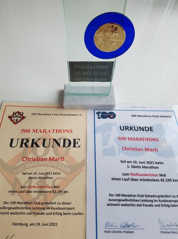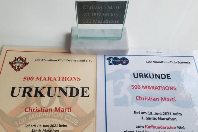 Christian Marti vom 100 Marathon Club Schweiz lief am 19. Juni 2021 beim 1. Säntis Marathon zum 500. Mal einen Lauf über mindestens 42,195 km.