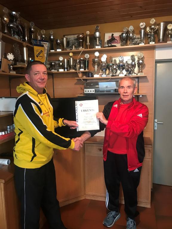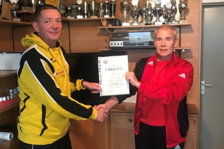 Urkundenübergabe zum 250. Marathon für Ralf Lietz (mit Statistiker Michael Kiene links)