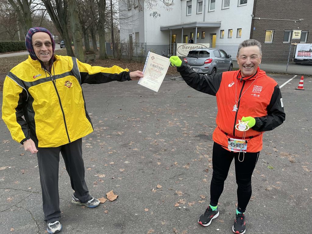 Die Ehrung zum 600. Marathon fand durch Klaus statt. Das war ein eingespieltes Team, denn Klaus hatte an gleicher Stelle Ulrich auch zu seinem 300. Marathon die Urkunde überreicht.