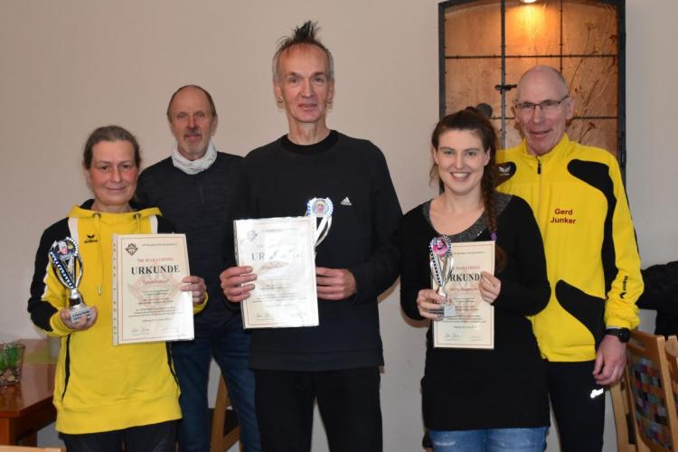 Das erlebt man nicht allzu oft! Am 15. Januar 2022 gab es beim Panorama Marathon in Bad Münder gleich drei Laufjubiläen zu feiern. Detlef Erasmus bietet seit Jahren diesen schönen Landschaftslauf an, heute lief diesbezüglich die 47. Veranstaltung. Drei unserer Mitglieder genossen ihren Jubiläumslauf in schöner Umgebung. Vom Veranstalter wurde jedem Jubilar ein Pokal überreicht, anschließend erhielt jeder seine wohlverdiente Urkunde vom 100 Marathon Club.