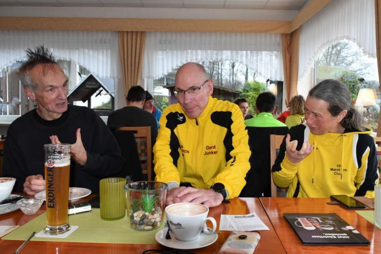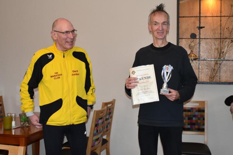 Jürgen Bultmann läuft mittlerweile in der M60 und selbst bei leichtem Frost in kurzer Hose und T-Shirt. Er kann selbst im profilierten Gelände unter 3:30 h laufen und bewältigte heute leicht und locker seinen 200. M/U.