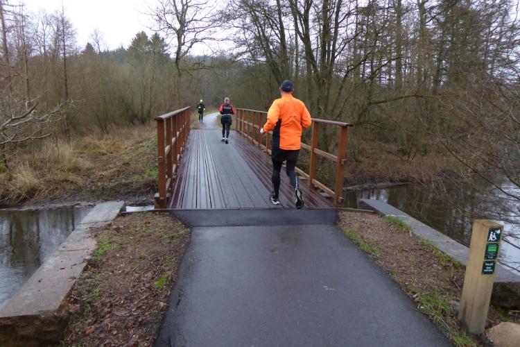 34 Marathonwalker starteten bereits um 8 Uhr. 23 Marathonläufer, die „angeblich“ Zeiten über 5:30 Stunden benötigen, liefen um 9 Uhr los und das Hauptfeld (207 Starter) setzte sich um 10 Uhr in Bewegung. Die Marathonstrecke auf einer ehemaligen Bahntrasse hat eine Wendeschleife bei der Streckenhälfte, ist ansonsten eine Pendelstrecke. Die 194 Halbmarathonläufer starteten auf der Wendeschleife der Marathonläufer ebenfalls um 10 Uhr und kamen den Marathonläufern somit Richtung Ziel entgegen. Die Zeitmessung für die insgesamt 458 Starter erfolgte mit Netto- und Bruttozeit durch einen Transponder in der Startnummer.