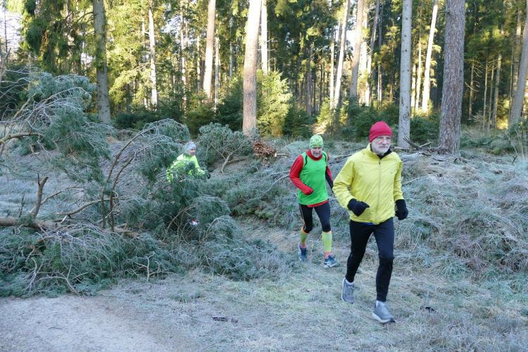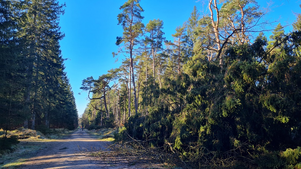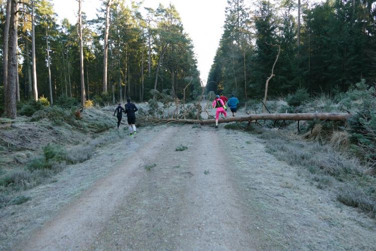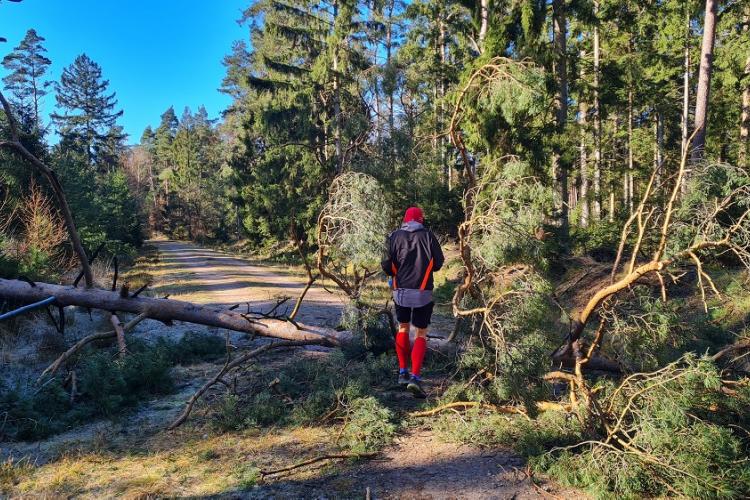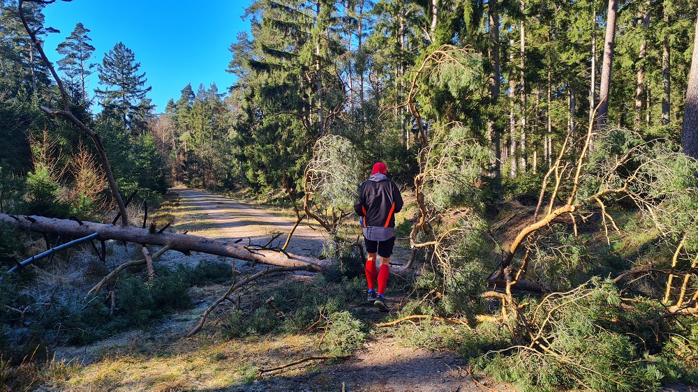 Bei einer letzten Streckenbesichtigung am Freitagnachmittag vor dem 4. Individual Wald Marathon (Sonntag, den 27.02.2022) stellte der Quentsch fest, dass der inzwischen bereits zum vierten Mal angedachte Streckenverlauf des Individual Wald Marathons nicht laufbar ist. Durch den starken Sturm der letzten Tage waren hunderte Bäume im Segeberger Forst umgekippt und natürlich lagen einige komplett über den angedachten Laufwegen. Den kleinen Laufevent absagen? Kommt nicht in Frage, also Plan B noch in der Dunkelheit ausmessen und mit etwas Flatterband markieren. Statt einer Runde nun ein 2,11 km Pendelstück, auf dem nur ein einziger Baum lag, den der Aktive aber überspringen bzw. im Seitenbereich des Weges umlaufen konnte.
