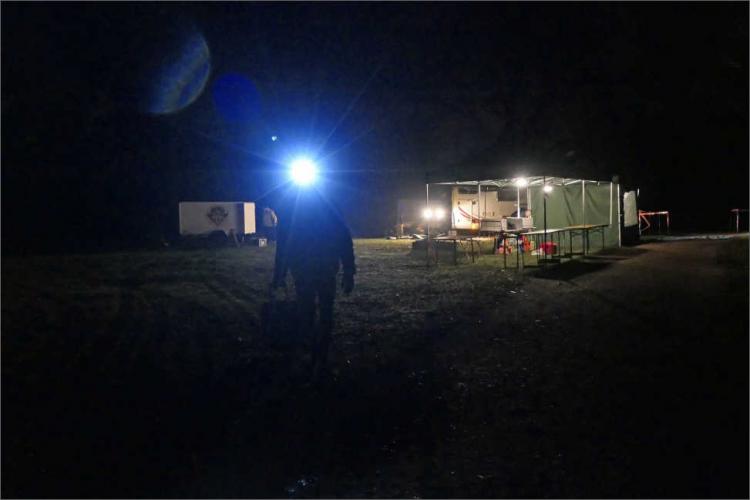 Nachdem wir pünktlich um 6:00 Uhr die Berliner vom Bäcker in Henstedt-Ulzburg abgeholt haben, geht die Fahrt weiter zum Öjendorfer See. Die Einbahnstraße wegen der Baustelle in der Barsbütteler Straße scheint aufgehoben zu sein, aber mit dem Materialanhänger hinter dem Wagen möchte ich nicht experimentieren und fahre von Süden an den Parkplatz heran. Als wir eintreffen ist es bis auf die Bauscheinwerfer stockdunkel. Obwohl wir keine 5 Meter von dem bereits aufgebauten und beleuchteten Verpflegungszelt parken, ist es nicht so einfach den Anhänger zu entladen. Da ist Klaus mit seiner Stirnlampe besser vorbereitet, doch der startet jetzt mit Sägemehl und den KM-Schilder bewaffnet zu seiner ersten Runde um den See, um die Strecke zu markieren. Natürlich sind noch weitere Helfer da, die die Zeltlandschaft, Tische, Schilder, Zeitnahme und viele mehr schon aufgebaut haben und weiter aufbauen. Nachdem alle Lebensmittel im Zelt sind, beginnt die Vorbereitung des Läuferbuffets. Es wird der erste Kaffee ausgeschenkt, der Tee wird in die Behälter geschüttet, Brote geschmiert, Bananen gestückelt und die Schale angeritzt, Äpfel entkernt und geachtelt, Kuchen und Pizzabrötchen in mundgerechte Stückchen geteilt und auf den Servierplatten angerichtet. Eier und saure Gurken halbiert, Schokolade, Müsliriegel geschnitten. Jetzt erscheint Jana, spendet einen Kuchen und beginnt mit ihrer Freundin die Getränke aufzufüllen, da die beiden erst um 9:00 Uhr starten. Die Hilfe ist sehr willkommen, da Doris sich für den Frühstart fertig machen möchte. Nach einem kurzen Wortgefecht mit einem Hundebesitzer, der weder einen seiner großen Hunde (der wollte sich im Verpflegungszelt mal umschauen) noch sein Mundwerk (hat einem unserer Helfer Schläge angedroht) unter Kontrolle hat, geht es positiv weiter: Burkhard bringt eine weitere Kuchenspende vorbei und Werner bedankt sich für unseren tollen Service bereits vor dem Start mit einer großzügigen Spende in unser Laufschwein.