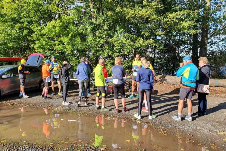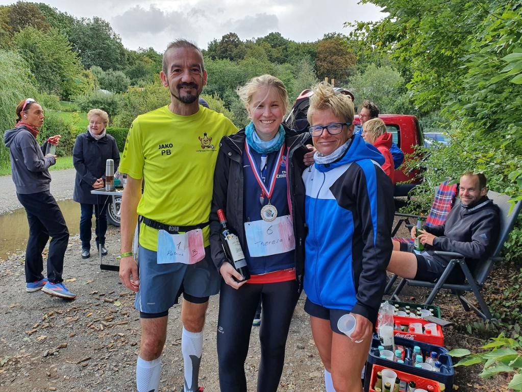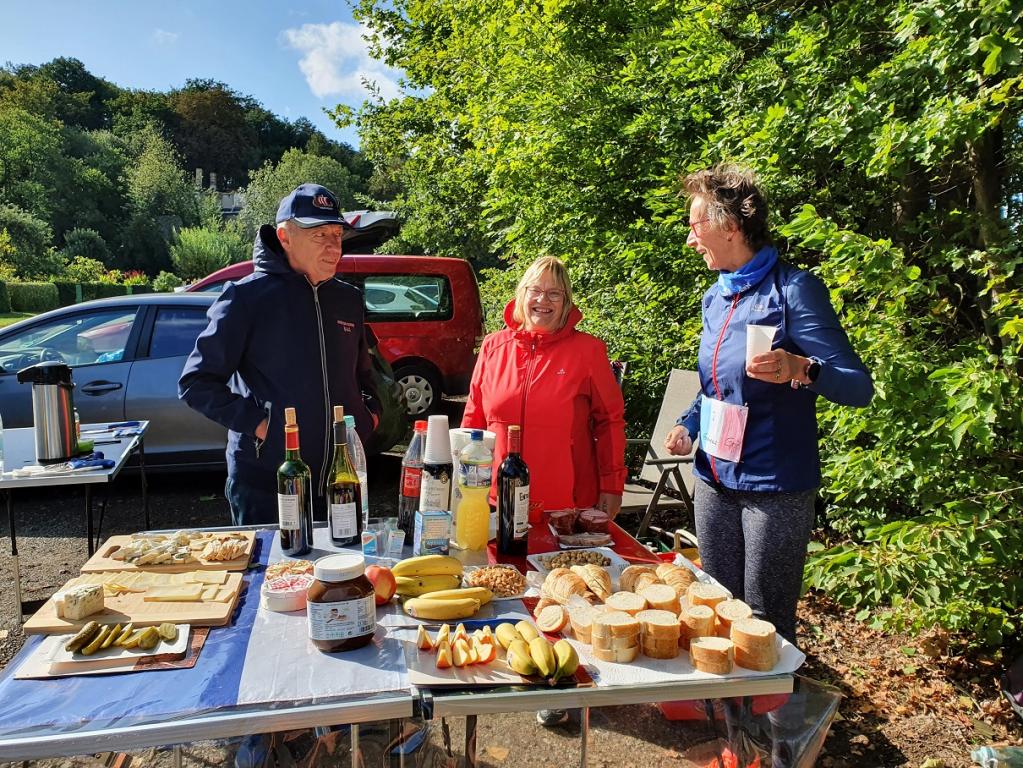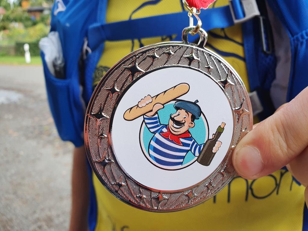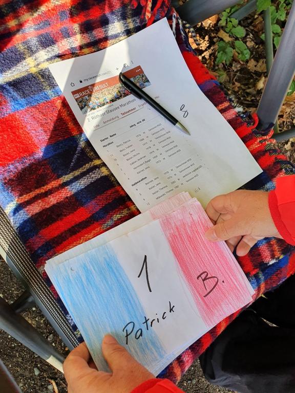Die Halbmarathonis, die ihren Lauf erfolgreich beendet hatten, hielten es hier auch noch eine ganze Weile aus, bis schließlich das Wetter trübe wurde und der kalte Wind zum Aufbruch rief. Doch auch die Marathonis bekamen nur einen kurzen Schauer ab und schafften es schließlich halbwegs trocken ins Ziel. Hier wurde dann die Medaille von Patrick übergeben, das Baguette aufgegessen, die offene Rotweinflasche geleert und den Helfern gedankt.