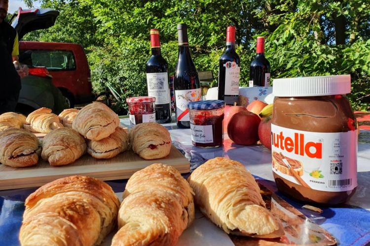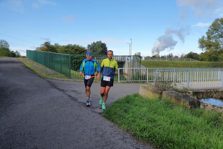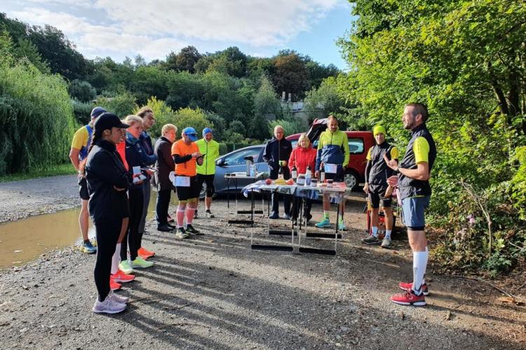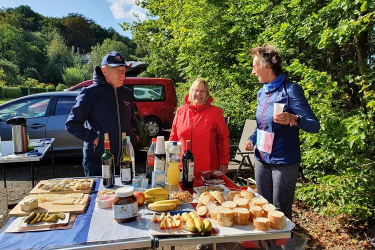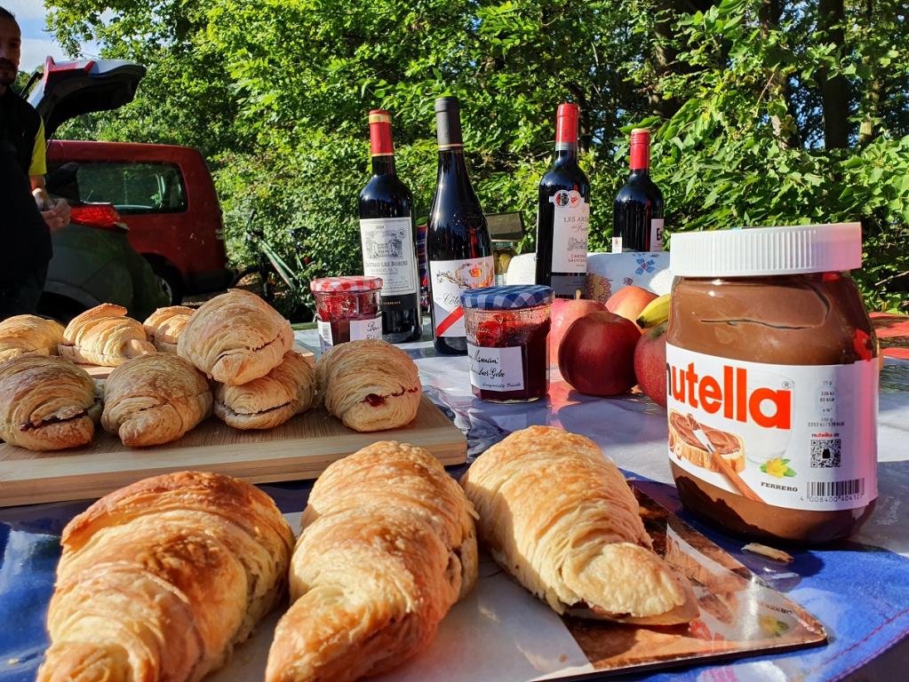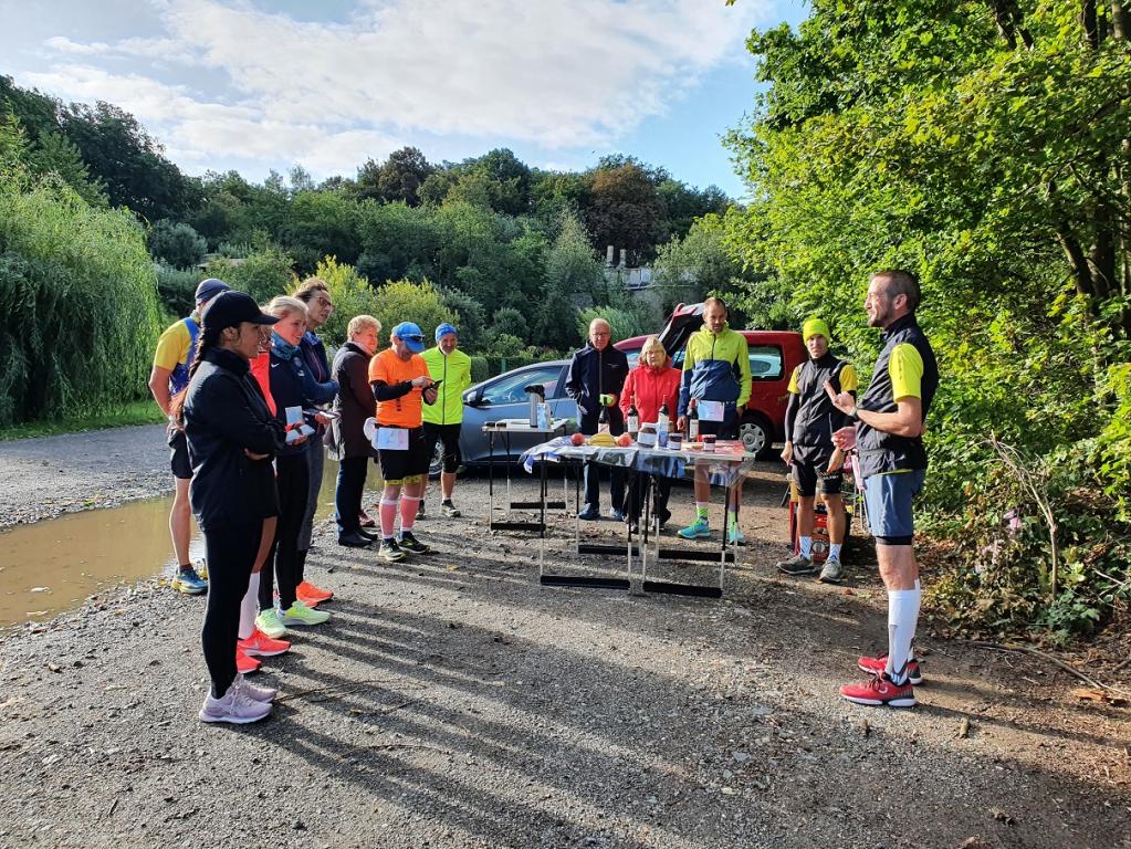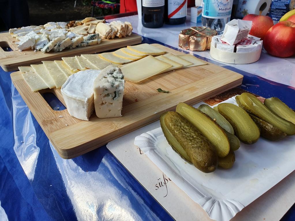 Nach dem kurzen Briefing und dem Startfoto wurde die erste Runde gemeinsam gelaufen: 3,9 Kilometer um den Stausee, der zwischen 1938 und 1942 als Hochwasserrückhaltebecken und Brauchwasserlieferant für die Braunkohleindustrie in der Region erbaut worden ist. Danach gab es ein Frühstück im französischen Stil: Croissants und Kaffee. Später wurden verschiedene Sorten Käse und Baguette serviert, aber auch Wurst und Süßigkeiten. Dazu gab es Wasser, Cola und verschiedene Rotweine.