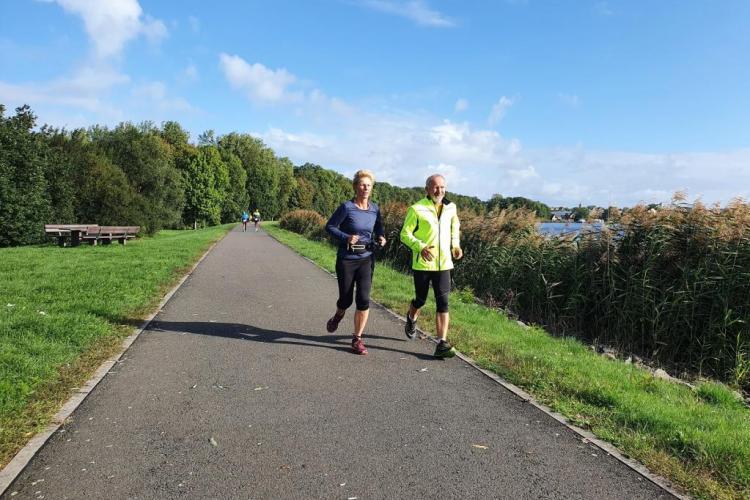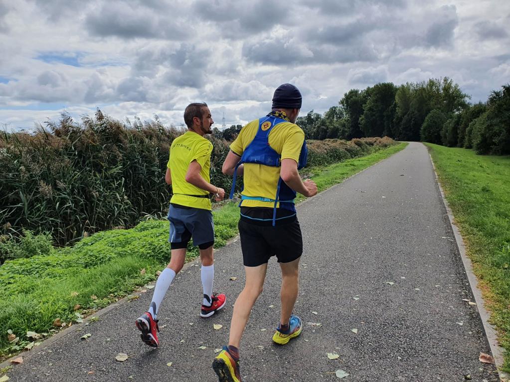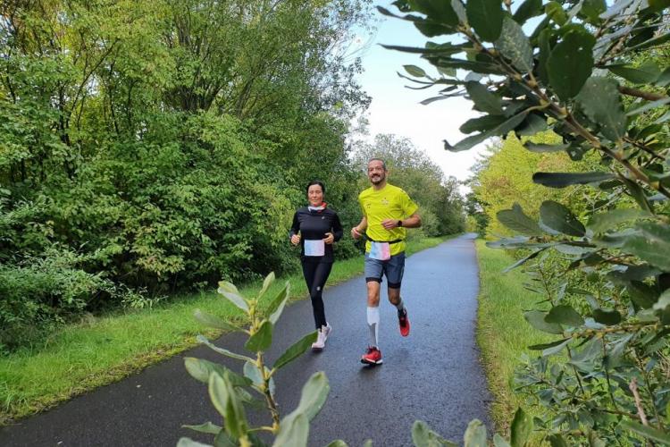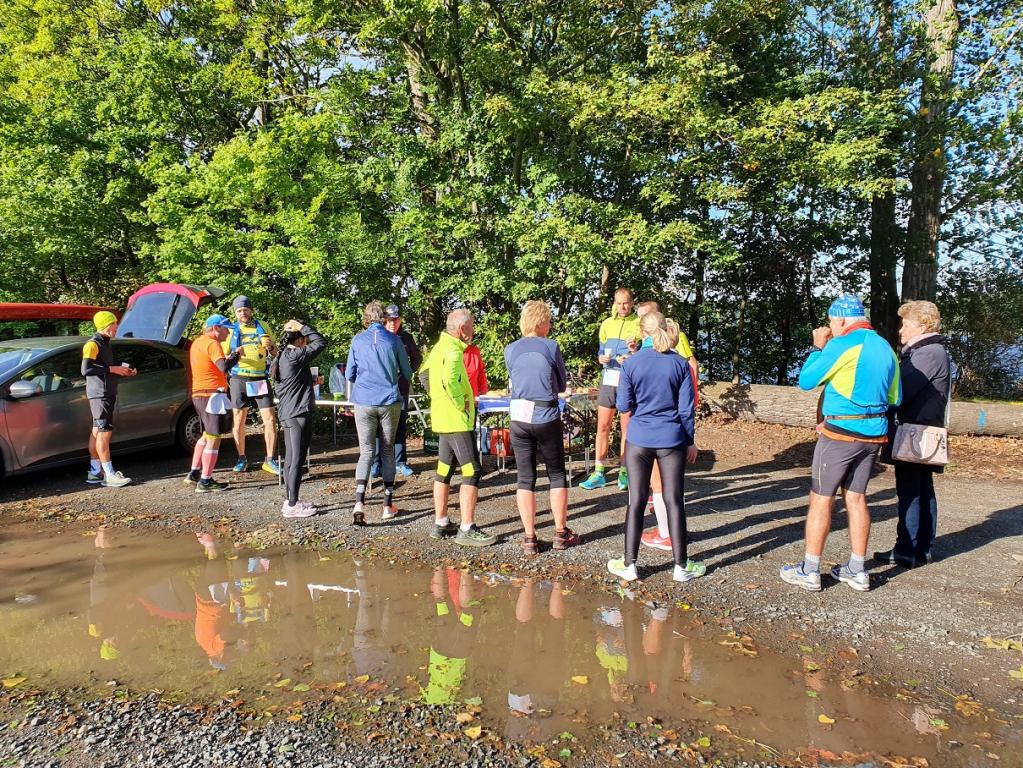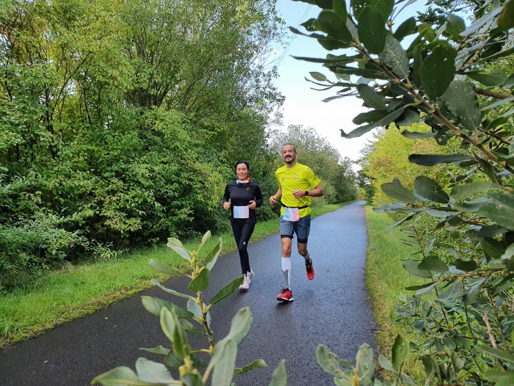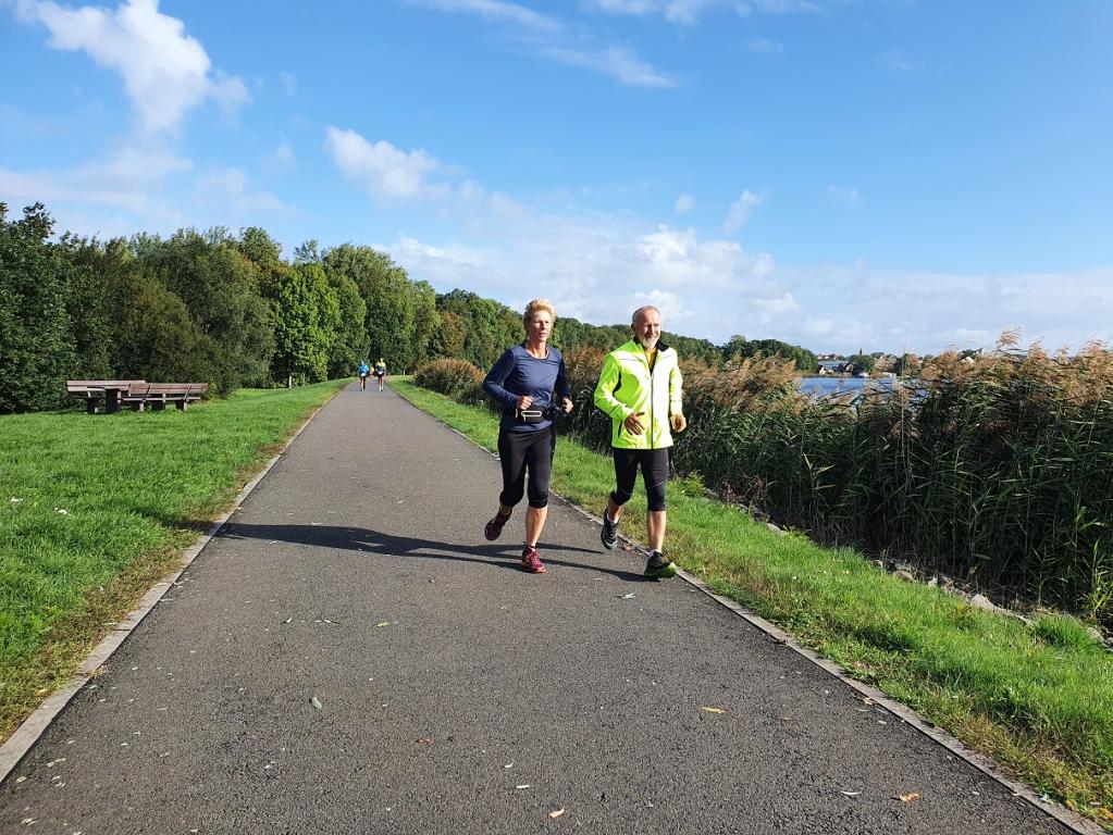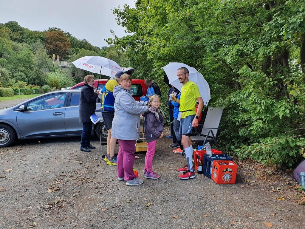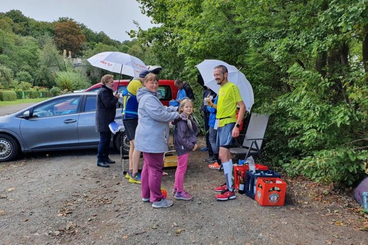 Die Strecke war kurzweilig und gut laufbar. Hauptsächlich asphaltierte Wege um den Stausee führten die Läufer entlang grüner Wiesen und durch ein kleines Waldstück. Wir hatten die Möglichkeit, uns während des Laufs mit verschiedenen Teilnehmern, Gästen und Joggern entlang der Strecke zu unterhalten, sodass die Zeit schnell verging. Alle 3,9 Kilometer kam man zurück zum Start/Ziel, wo die beiden Helfer Manfred und Evelyn auf die Sachen aufpassten und Getränke in Becher füllten.