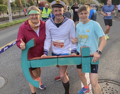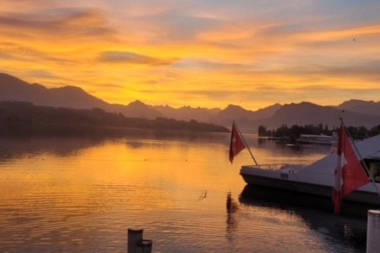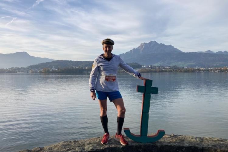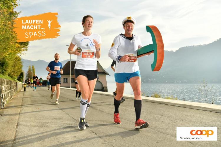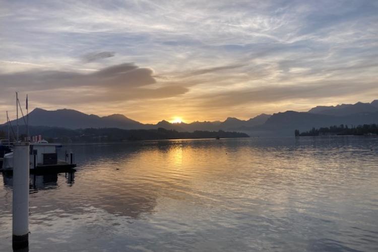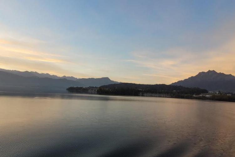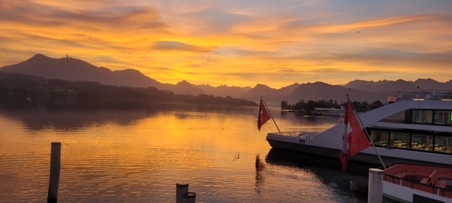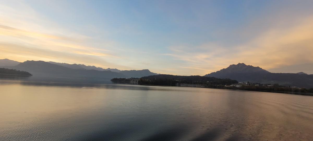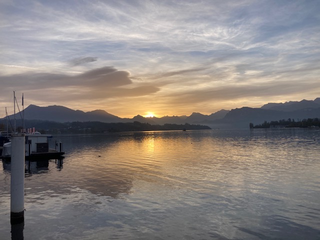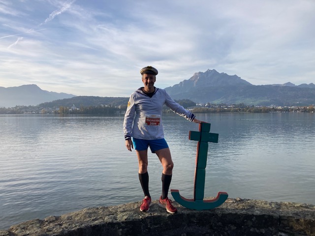 Sonntag dann der Lauf, die Anfahrt zum Zielbereich fand mit dem Schiff über den Vierwaldstädter See statt - das war schon traumhaft. Die Gegend um den 114 km² großen See gilt als die Keimzelle der Schweiz. Die Wettervorhersage war fantastisch und so kam es auch, der Tag war warm und sonnig. Ein wunderschöner Sonnenaufgang über den Bergen stimmte uns morgens schon auf diesen wundervollen Tag ein. Etwas verunsichert waren wir wegen der Gepäckaufbewahrung, das haben wir selbst geklärt. Aus der Starterliste hatten wir gesehen das Thorsten und Klaus am Start sein sollte und mit Thorsten " Stulle" haben wir uns dann auch am Start getroffen. Er lief in "Norddeutscher " Kluft, mal wieder als Kapitän, wollte aber flotter als wir laufen um evtl. seine Tochter, die für den Halbmarathon gemeldet war, einzusammeln. Die erste Runde haben wir uns 2 Pacemakern (5h) angeschlossen, die Runde war toll, flott und kurzweilig. Man läuft direkt am Wasser entlang, etwas rauf und runter, kommt durch den Vorort Horw (Kein sozialer Brennpunkt) und läuft dann Richtung Innenstadt zurück.
