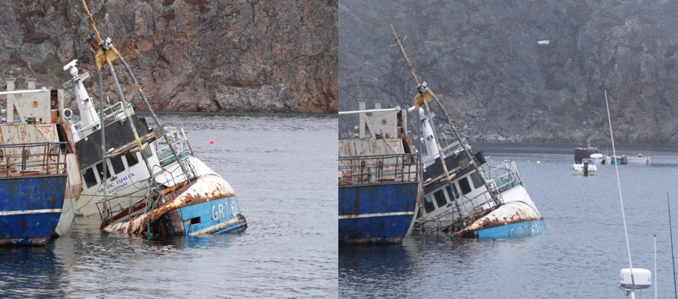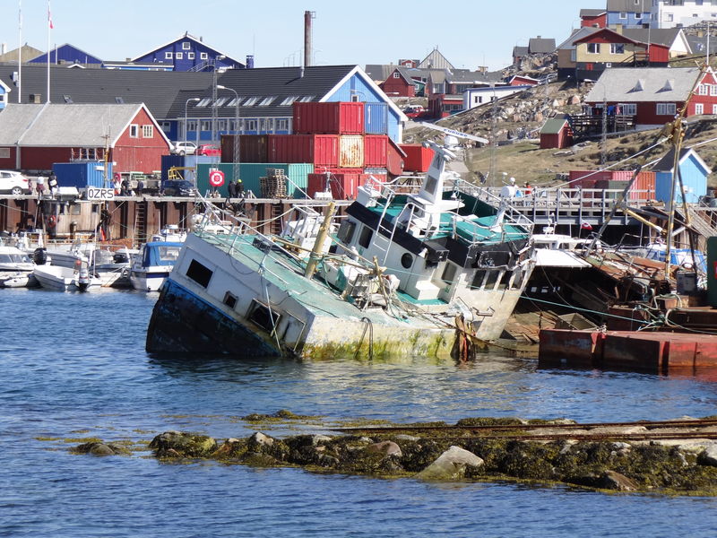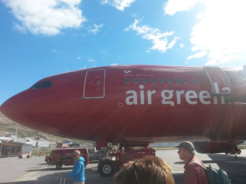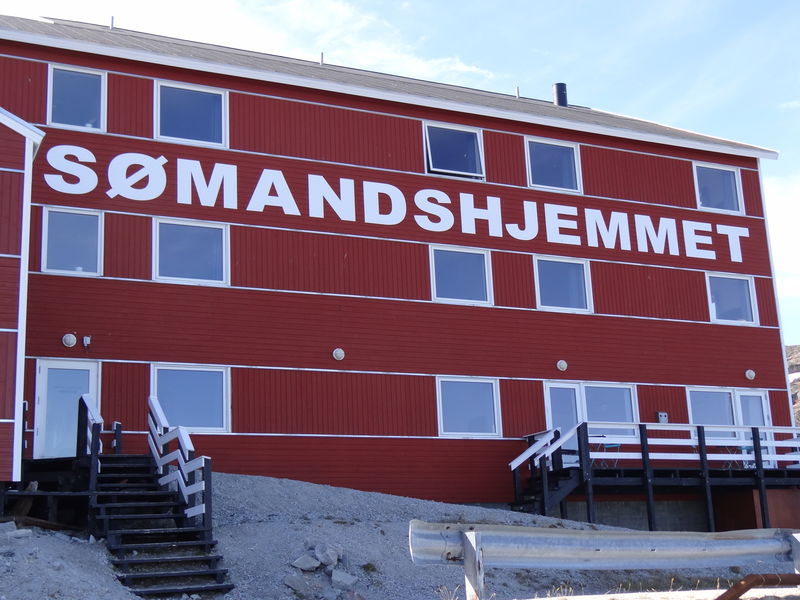 Mittwoch morgen ging es los über Kopenhagen mit SAS und von dort weiter mit Air Greenland nach Kangerlussuaq, dem Umsteigeflughafen auf Grönland und von dort mit einer Propellermaschine nach Aasiaat. An der Westküste Grönlands am südlichen Ende der Diskobucht gelegen. Die fünftgrößte Stadt mit gut 3.000 Einwohnern, dem Versorgungshafen für ganz Nordgrönland, einem Krankenhaus und einem von 3 Gymnasien. Der Flughafen war recht klein und es gab nur ein Taxi – und das war offensichtlich bestellt. Auch das zweite war vorbestellt, so dass wir mit unseren Reisetaschen losgingen, um die lt. Google maps 3,8 km zu Fuß zu bewältigen. Die Sonne schien, es war mild; also kein Problem. Nach der halben Strecke und dem ersten Anstieg, den wir später beim Marathonlauf 4-mal zu bewältigen hatten, nahm uns ein freundlicher Grönländer in seinem VW-Bus mit und setzte uns direkt vor unserem Hotel, dem Seemannsheim, ab. Nach dem Einchecken fand sich auch gleich die Antwort auf unsere erste Frage, mit wem wir denn eine Bootsfahrt auf die Diskobucht machen könnten. Der Manager des Hotels bot solche Fahrten an und wir buchten für den Nachmittag. In der Zwischenzeit machten wir den ersten Erkundungsspaziergang durch den Ort, meldeten uns in einer Boutique mit angeschlossenem Sportgeschäft zum Marathonlauf an. Erst jetzt waren wir richtig sicher, dass wir auch laufen würden, denn die Veranstaltung hat keine Homepage. Es gibt zwar eine facebook-Seite, wo der Termin angekündigt wurde, nur das meiste wurde dort auf grönländisch geschrieben und dafür gibt es keine Übersetzungshilfe. (Die meisten Informationen hatten wir deshalb von den Country Clubbern Jürgen Sinthofen (Reisebericht) und Klaus Westphal (Hotelempfehlung, Anreise) bekommen. Danke dafür!)