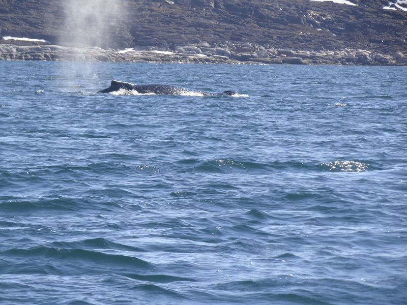 Am Nachmittag des Anreisetags fuhren wir mit dem Hotelmanager auf die Bucht, schauten die phantastische Vielfalt der Eisberge an, wobei wir mit unserem Boot ehrfürchtig den erforderlichen Sicherheitsabstand einhielten, denn die Brocken zeigen bekanntlich nur 10% ihrer Größe über der Wasserlinie. Danach ging es weiter zum Wale schauen und wir hatten Glück, dass sich zwei Stück immer wieder zeigten. Durch die außerordentliche Ruhe konnten wir das Luftauspusten ungestört hören und beobachten. Am späten Abend, kurz vor Mitternacht, zogen wir aus dem Hotel wieder los auf Entdeckungstour, denn die Sonne schien und diese Gelegenheit der Mitternachtssonne wollten wir ausnutzen. Wenn wir tagsüber die Sonnenbrille trugen, nahmen wir sie nachts sicherheitshalber auch mit, brauchte man aber nicht. Überall waren Leute unterwegs, die übrigens alle freundlich grüßen, was wir nach kurzer Zeit sehr genossen. Im Hafen wurde zwischen den Containern Fussball gespielt, Kinder waren auch noch auf den Spielplätzen (dazu Jan: „Wir rufen die Kinder rein, wenn es dunkel wird. Hahaha.“) oder die Menschen saugten auf Bänken sitzend die Bilder der tiefstehenden Sonne über der Bucht, den Schäreninseln und den Eisbergen auf. Am nächsten Morgen (oder ein paar Stunden später) nahmen wir ein prima Frühstück in dem Speiseraum des Seemannheims ein, in dem sich auch Arbeiter aus den umliegenden Firmen oder Familien mit Kindern (es sind gerade Sommerferien) ein. Anhand der vorab veröffentlichten Streckenkarte liefen wir die Strecke ab, die bereits überall mit Pfeilen markiert war. Da wir aber mit keiner allzu großen Teilnehmerzahl beim Marathon rechneten, wollten wir sie vorher schon mal erkunden. So kamen wir durch Wohngebiete, vorbei an einem Felsen mit 24 Schlittenhunden (angekettet! Zum Glück, denn im Reiseführer stand, dass sie im Sommer nur 2.mal pro Woche Fressen bekommen –später erzählte uns der Marathonsieger, dass er seine 14 Hunde täglich füttert.), am Gymnasium, an dem Gemeinschaftshaus für die Siegerehrung incl. Abendessen, an dem Geschäft mit der Anmeldung, am Hafen, am Krankenhaus, an der Sporthalle und die Straße zum Flughafen entlang. Diese 10,5 km-Runde war am Freitag 4-mal zu absolvieren. Insgesamt sollen es 700 Höhenmeter gewesen sein. Ich habs nicht gemessen, aber bestenlistenfähig ist die Strecke definitiv nicht. Umso exzellenter die Siegerzeit in 2:57 Stunden – auf meine Frage, wie schnell er denn auf einer flachen Strecke wäre, erwiderte er, dass er in Berlin ebenfalls um die 2:55 gelaufen wäre.