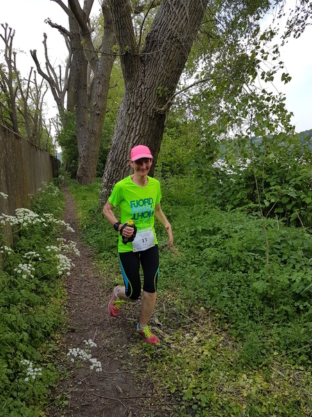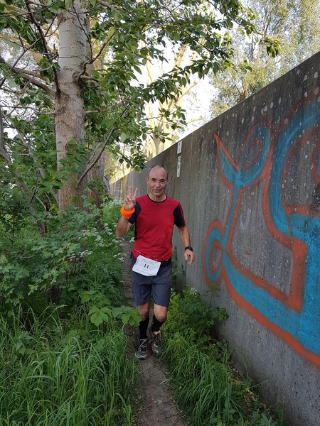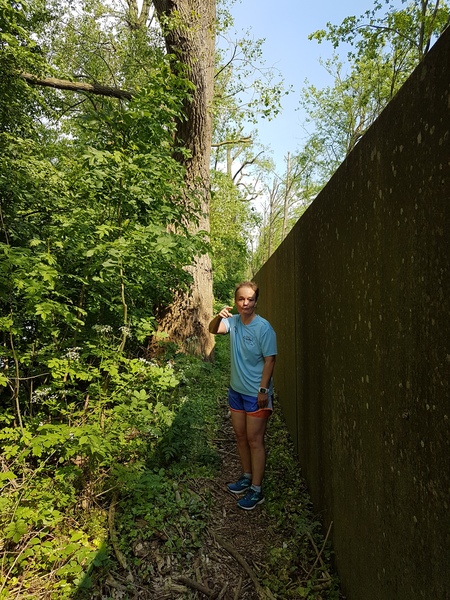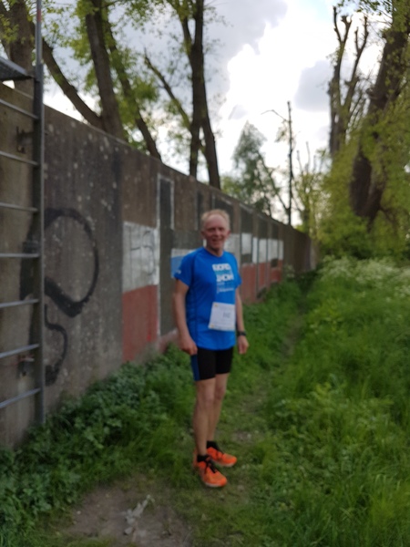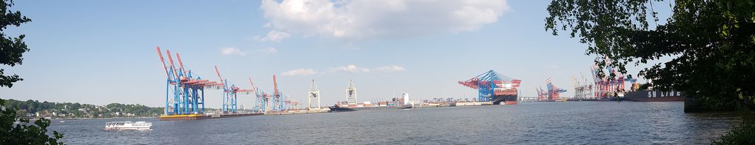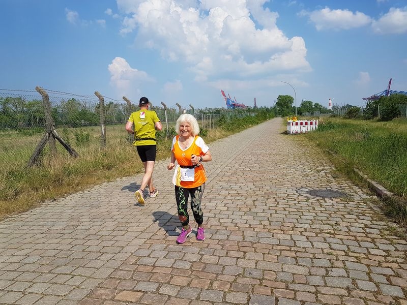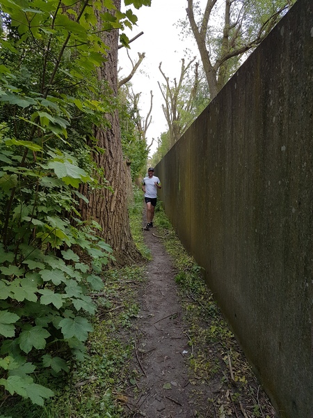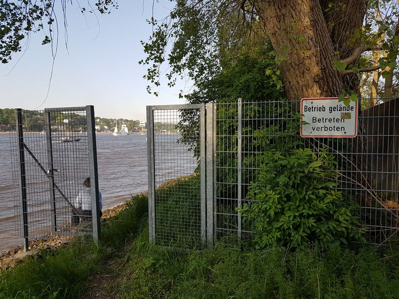 Die zweite Wendepunktstrecke bietet immer wieder spektakuläre Ausblicke auf die Elbe und in angrenzende Hafenbecken. Zu Beginn muss sich der Läufer aber erst mal zwischen Wand und Geländer durchschieben, um in den Grünstreifen zu gelangen. Alternativ kann man auch eben über das Geländer klettern. Nun laufe ich auf einem schmalen Pfad, neudeutsch Singletrail. An einer Seite, die ca. 2 Meter hohe Flutschutzmauer, zur anderen Seite, der grandiose Ausblick. Hier sind wir größtenteils im Schatten der alten Pappeln, die das Ufer Säumen.