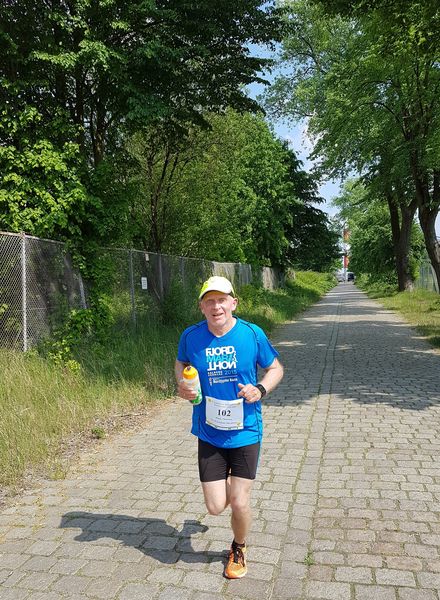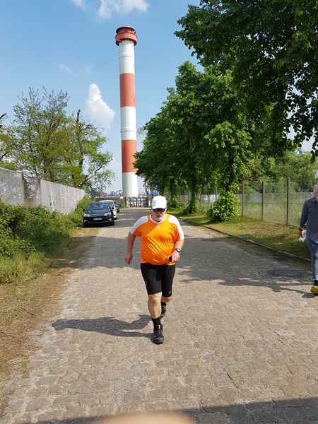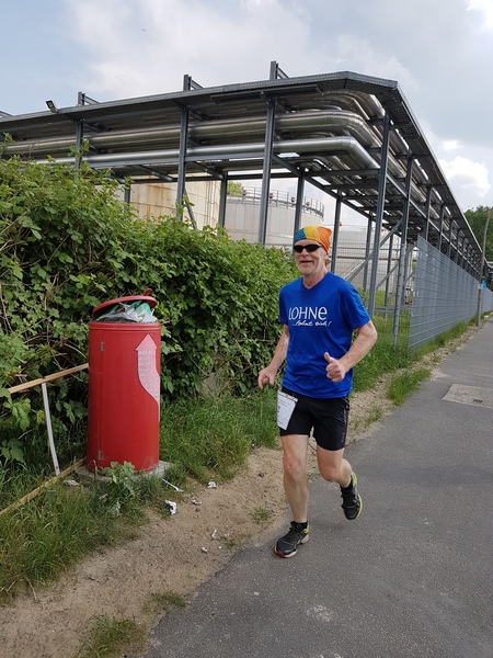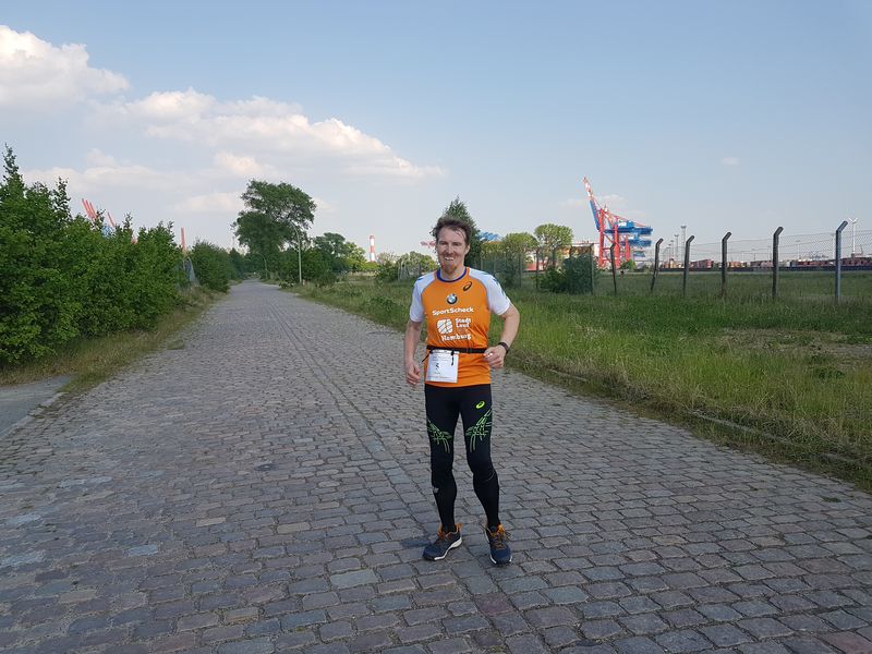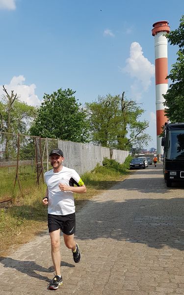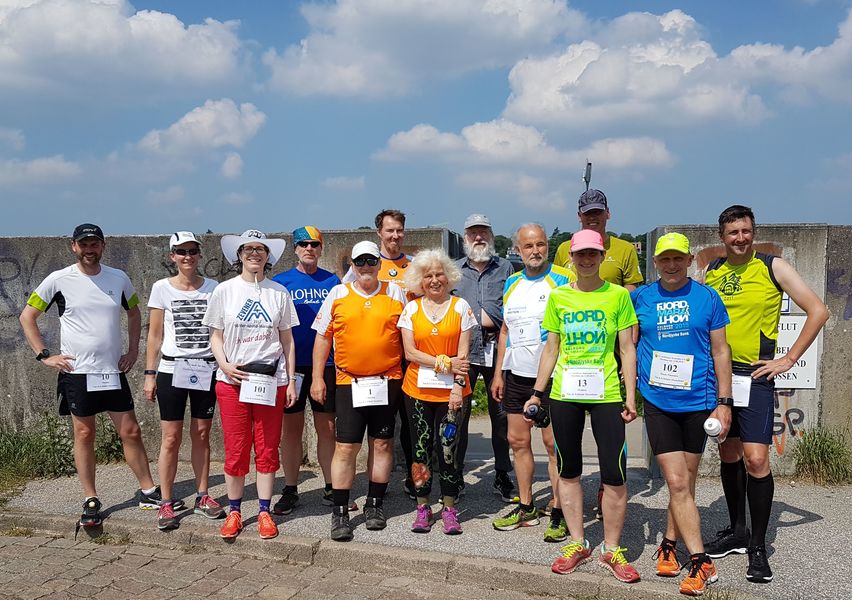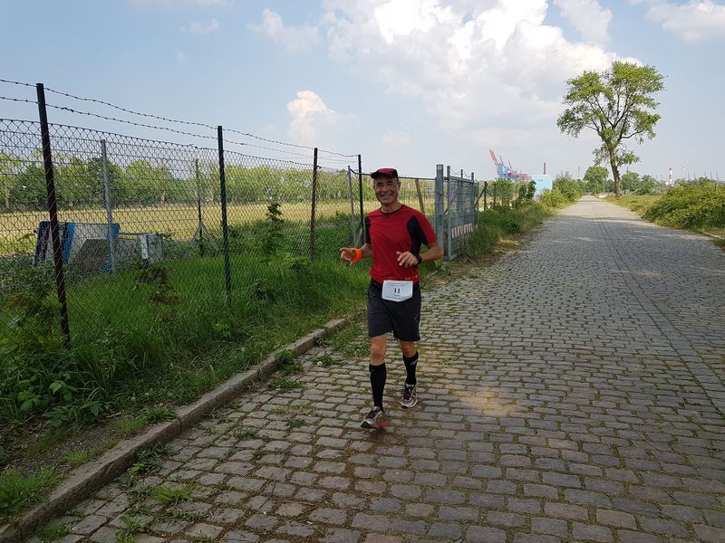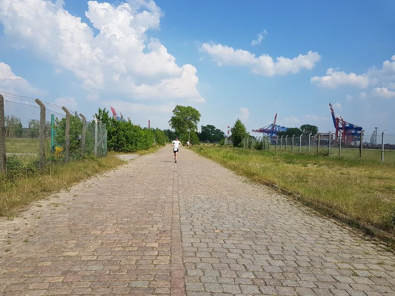 Die 15 Dauerläufer machten sich bei herrlichstem Sommerwetter auf die Strecke. Zum Glück hatte ich mich ordentlich mit Sonnencreme eingeschmiert. Bei der Strecke handelt es sich um eine doppelte Wendepunktstrecke, bei der der Start-/Ziel-/Verpflegungspunkt ziemlich mittig, direkt an der Flutschutzmauer liegt. Erst ging es ins Hinterland, die Tankstraße bis zum Ende durch, bis auf einige Meter ans namengebende Leuchtfeuer Bubendey-Ufer heran. Bei der Tankstrasse handelt es sich um eine Kopfsteinpflasterstraße, die größtenteils in der prallen Sonne lag.