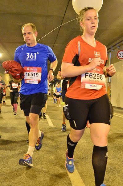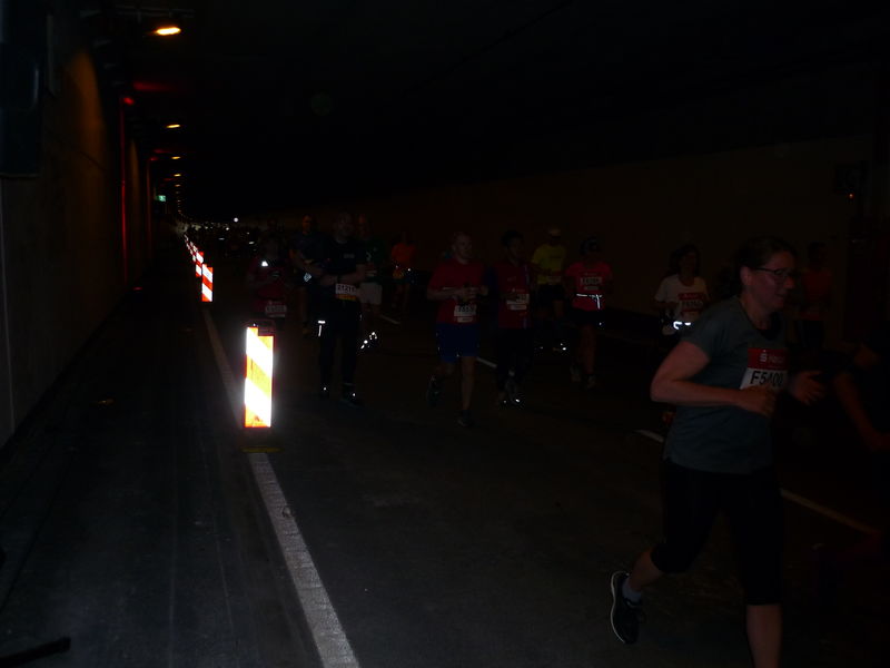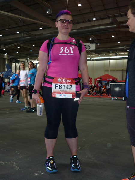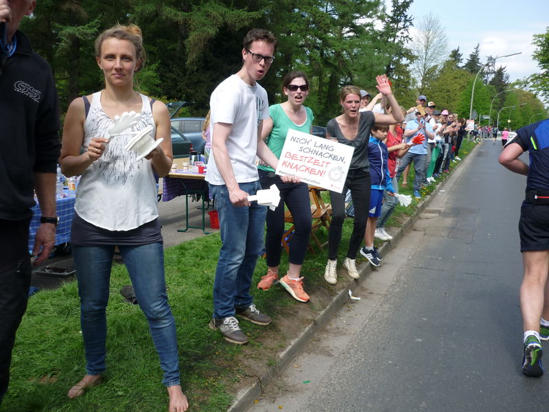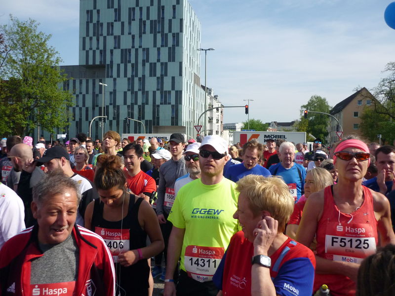 Zusammen mit Jennifer startete der Quentsch aus dem Startblock N, gleichzeitig auch der letzte Startblock. Schon vor dem Start versammelten sich ein paar Teilnehmer, die es unter 5 Stunden schaffen wollten, um die beiden Pacemaker. Knapp 13 Minuten nach dem Startschuss überlief der Startblock N die Startlinie und nun hieß es jeden Kilometer in knapp sieben Minuten abzuspulen, um sich erst einmal bis zur Hälfte einen kleinen Zeitpuffer zu erspielen. Die 21,1 km Marke wurde nach 2:26:48 Minuten (Schnitt 6:57 Minuten pro km) erreicht. Zu diesem Zeitpunkt waren bereits einige Langstreckenläufer zurückgeblieben, die das Vorhaben sub 5 Stunden frühzeitig zu den Akten legen konnten.