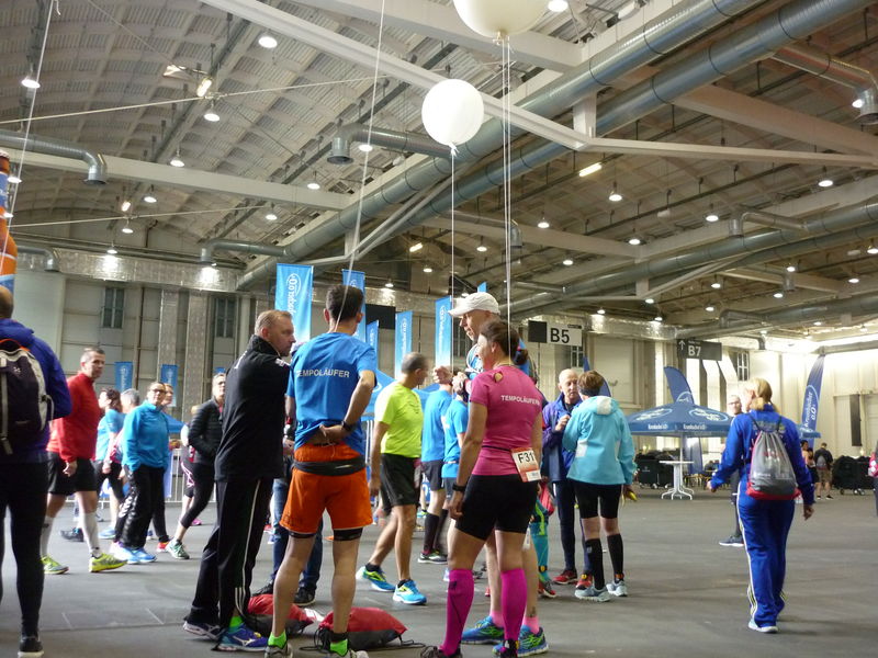 Natürlich hat der Quentsch als fünf Stunden Tempomacher sofort zugesagt und bekam damit auch einen Freistart (zu dem Zeitpunkt immerhin 100 Euro Startgebühr!) und wurde mit Laufhose und Laufshirt eingekleidet. Außerdem wurde er mit Bild und Text auf der Hamburg Marathon Homepage vorgestellt. Zusammen mit der noch recht unerfahrenen Jennifer aus Hamburg, die erst seit 2014 läuft (bisher zwei Marathonläufe/Bestzeit 4:42 Std.) sollten die 42,195 km in knapp fünf Stunden unter die Laufschuhe genommen werden. Beim Abholen der Ballons in Messehalle B5 um 8 Uhr am Starttag fielen aber die ersten Probleme auf: Die Zeitaufschrift war eigentlich auf den Ballons viel zu schwach (die Werbung viel deutlicher zu erkennen) und die Bänder viel zu lang. OK, die Bandlänge wurden vor dem Start noch ein ganzes Stück reduziert, an der Aufschrift ließ sich nichts mehr machen.