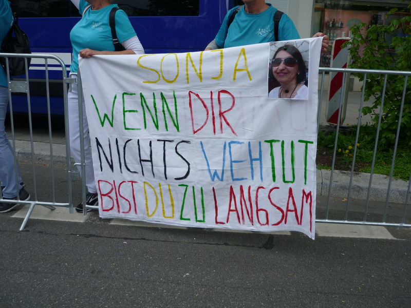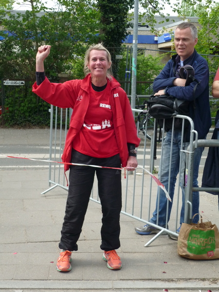 Dies gelang dann aber irgendwann nur noch mit der jungen Pauline, die an diesem Tag ihren ersten Marathon überhaupt lief. Allerdings hatte sie während des Laufes Knieschmerzen bekommen und kam besonders nach Gehpausen an den Getränkeständen nur schwer wieder auf Tempo und verlor dabei immer etwas an Boden. Also wurde die Taktik mit den Gehpausen vom Quentsch geändert. Pauline lief weiter und der Quentsch organisierte die Getränke und Pauline trank nun ohne zu stoppen. Bei km 40 zeigte die Uhr vom Quentsch 4:43:33 Stunden an und Pauline und der Quentsch befanden sich nur knapp 100 Meter hinter Pacemakerin Jennifer. Noch fast 16,5 Minuten Zeit für die letzten 2,2 km. Das Unternehmen sub 5 Stunden beim ersten Marathon für Pauline war zum Greifen nah. Doch nur weniger Meter hinter der Kilometermarke 40 blieb Pauline abrupt stehen und fing zu weinen an. Ihre Knieschmerzen hatten nun auch beim Laufen zugenommen und wohl zusammen mit der Erschöpfung ging für einen Moment gar nichts mehr. Sicherlich ein sehr bewegender Moment, den man nicht so schnell vergessen wird. Vom Quentsch gab es noch den Rat, nach Möglichkeit langsam weiter Richtung Ziel zu gehen bzw. zu laufen. Pauline überlief später nach 5:04:23 Stunden die Ziellinie.