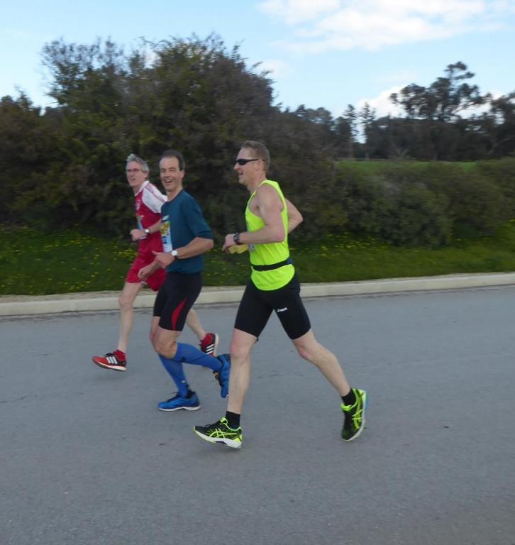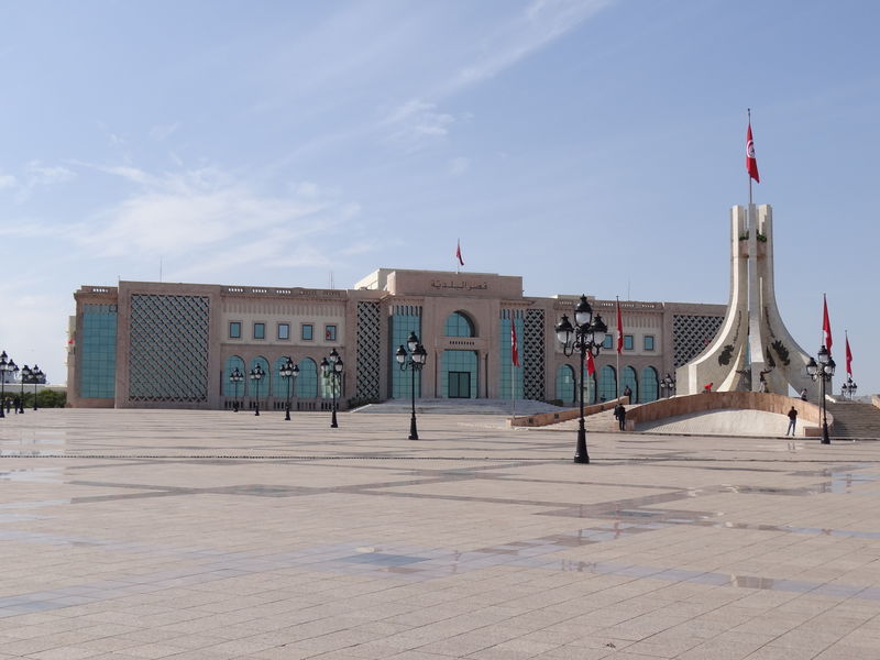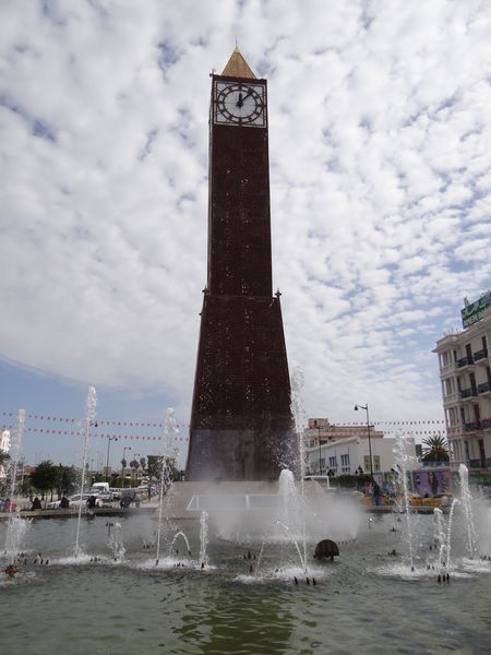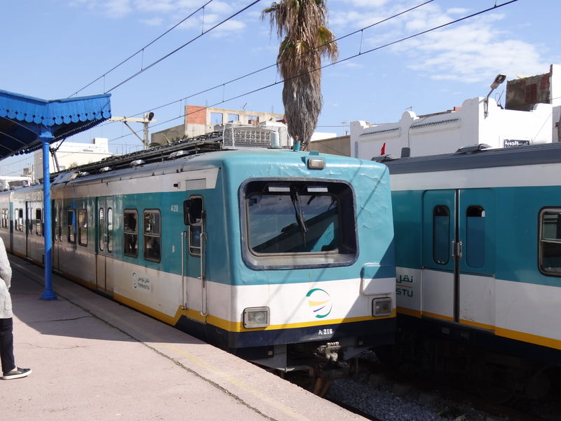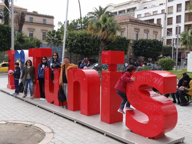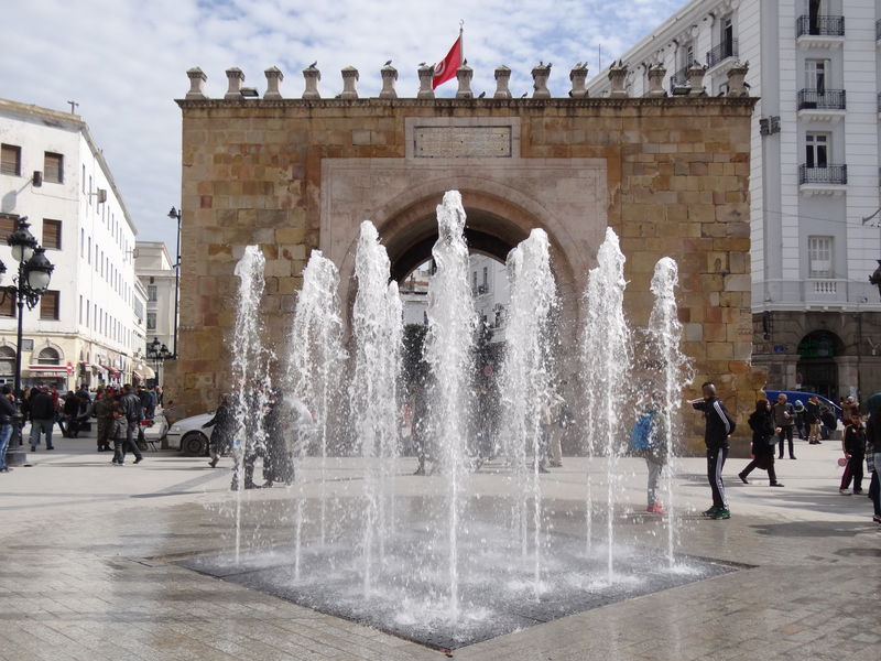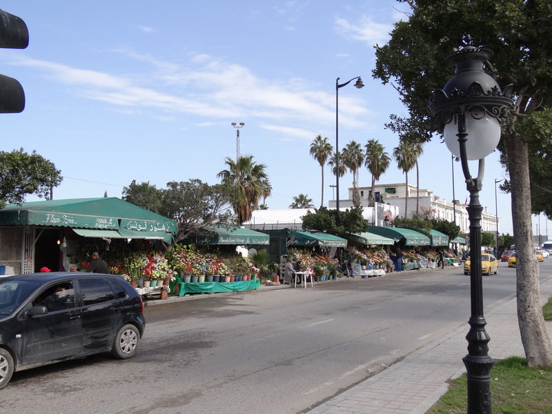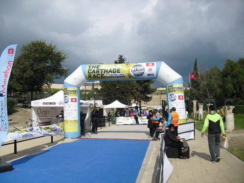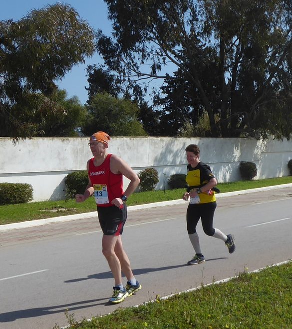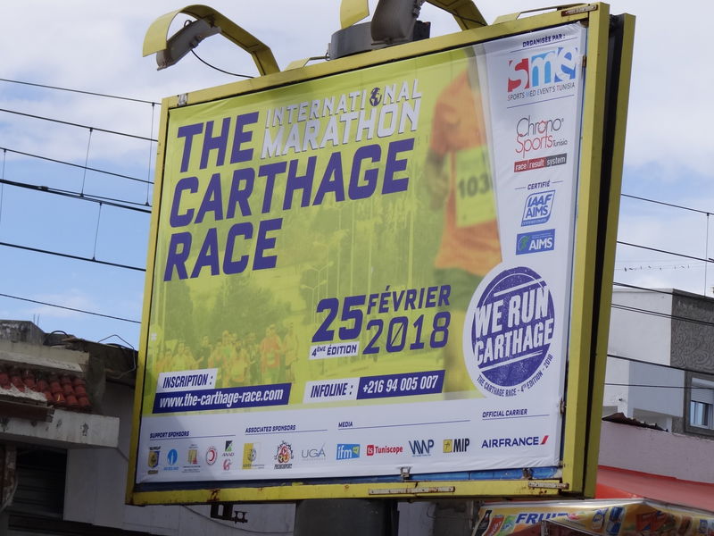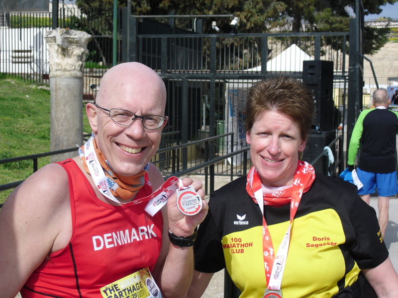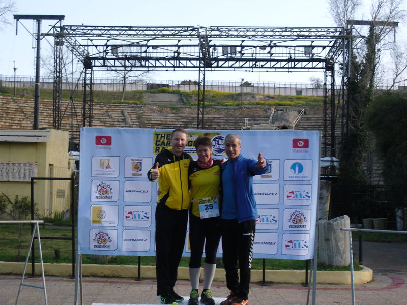 Und schon waren wir beim richtigen Amphitheater und trafen den Veranstalter, der uns berichtete, dass er mit gut 100 Marathonläufern rechnet. Danach gingen wir noch Richtung Küste, vorbei am römischen Friedhof und Badeanlagen. Da es schon dämmerte, nahmen wir für die Rückfahrt zur Unterkunft den Nahverkehrszug, der um diese Zeit noch alle 12 Minuten fuhr. Die Fahrkarte wird aus einem Häuschen am Bahnsteigzugang verkauft. Offensichtlich hatten wir aber einmal zu oft gefragt, ob der Zug auch nach Tunis fährt. Auf jeden Fall hatten wir am Freitag zuviel bezahlt, denn als wir am Samstag abend (nach dem Essen mit den Country Club Freunden) wieder die Strecke fuhren, sagte uns ein anderer Verkäufer einen geringeren Preis. Auf meine Nachfrage, warum es heute billiger wäre, sprach er von einem Missverständnis und schenkte uns die Fahrt am Samstag. Überraschung – Freude: dankeschön. Am Samstag trafen wir beim Frühstück eine Mitbewohnerin, die nachts angekommen war. Sie hatte sich ein freies Taxi am Flughafen genommen, was eigentlich günstiger gewesen wäre, aber der Fahrer die Straße nicht kannte, irrten sie einige Zeit herum und am Ende hat sie genauso viel bezahlt wie wir. Manchmal macht vorbestellen Sinn! Nachdem wir Cola für den Aufenthalt und den Lauf (während und danach) gekauft hatten (Kommentar unserer Mitbewohnerin zu 12 mal 0,5l-Flaschen: „Na, habt ihr Coke geladen?“) ging es mit der Bahn über den Damm nach Tunis. Direkt an der dortigen Endhaltestelle waren bestimmt 10 bis 15 große Blumenstände mit Schnittblumen: dafür hatten wir leider keine Zeit, denn wir wollten in die Medina. Herrlich, ähnlich wir sie aus Marrakesch kannten, wobei die Ladenzeilen schon etwas an den Bazar in Istanbul erinnerten. Überall schnackt dich jemand an; ständig wird am Ärmel gezupft – und alles vollkommen friedlich. Ein NEIN wird akzeptiert und niemand ist dir böse. Als wir einmal vom alten Stadttor bis zur Bücherei durchgewandert waren, bekamen wir Hunger und kauften uns einen Salat im aufgerollten Fladenbrot. Die erste Portion war lecker, so dass wir bei der zweiten leider nicht drauf achteten, nichts von der ROTEN Sauce draufstreichen zu lassen. Ich hatte das Gefühl, dass mein Mund verbrennt – so scharf war die Sauce. Puh, da mussten wir mit Cola löschen. Nach diesem „Brandanschlag“ fuhren wir wieder nach Karthago, um am Theater die Country Clubber (aus Frankreich, Finnland, Weißrussland, Dänemark und Deutschland) zu treffen, denn es war ein gemeinsames Abendessen vereinbart. Zur Sicherheit aßen wir Pizza und unterhielten uns prächtig, über Anreise, das Wetter, die etwas verwirrende Streckenführung und die nächsten Reisepläne. Am nächsten Morgen gab es in der Unterkunft noch lecker Frühstück (wieder warme Milch, so dass ich einen perfekten Milchkaffee genießen konnte) und wir fuhren per Bahn zum Start am Amphitheater. Dort trafen wir Mohammed, unseren tunesischen Lauffreund aus Hamburg. Er wollte eigentlich gar nicht laufen, sondern einige Wochen an seinem Haus (120 km von Tunis entfernt) renovieren. Als wir ihm am Telefon erzählten, dass wir in seinem Heimatland laufen würden, war er aber nicht zu bremsen und hat sich gleich angemeldet – und hat dann mal eben eine sub 3 rausgehauen und seine Altersklasse gewonnen: chapeau!