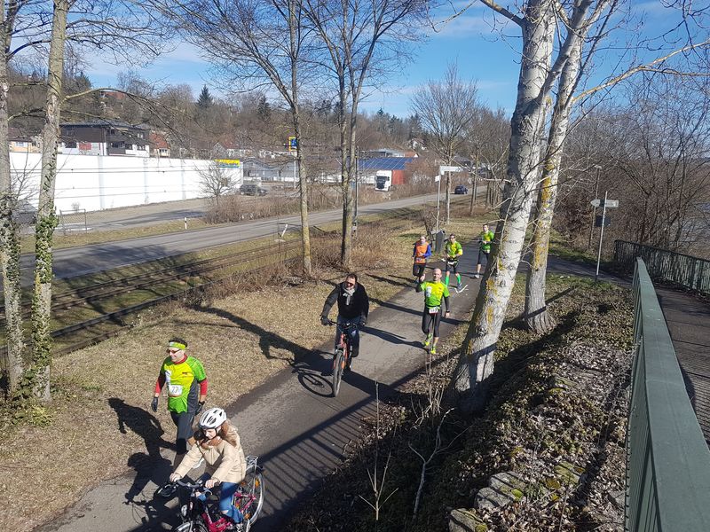 Die Clubmitglieder treffen sich noch zu einem Gruppenfoto, dann geht es auch schon los. Nach einigen Tagen mit knüppel kalten Temperaturen, zum Teil zweistellig unter 0 Grad, herrschen heute angenehme frühlingshafte Bedingungen. Allerdings hat es nachts wieder gefroren und so sind einige schattige Teile der Strecke noch gefroren und zum Teil sehr rutschig. Die Sonne hat hier allerdings auch schon gewaltig Kraft und wärmt recht angenehm.