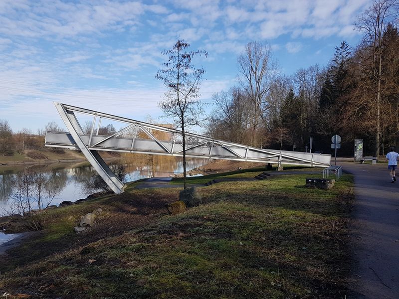 Vom Freizeitgelände am Max-Eyth-See im Stadtteil Stuttgart-Hofen geht es erst am Neckar abwärts, Richtung Norden. Ein Hingucker ist die Landungsbrücke Fellbach, eine abgesägte, ehemalige Eisenbahnbrücke, von der noch ein Stück über den Neckar ragt.