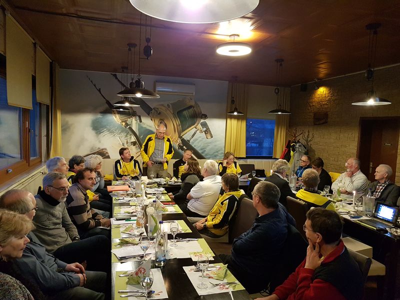 Sodann geht es auch schon weiter zur Jahreshauptversammlung des 100 Marathon Clubs in die Gaststätte 'Haus am See'. Dort sind im Nebenraum schon die Präsentationstechnik und die Vorbereitung zum Buffet aufgebaut. Der Vorstand und einige Clubmitglieder sind auch schon da, im Hintergrund laufen Bilder von vergangenen Laufveranstaltungen. Für mich ist es sehr interessant, einige Vereinskameraden aus dem Süden der Republik kennenzulernen, denen laufe ich sonst ja nicht so häufig über den Weg. Die Versammlung wird sehr professionell und eloquent vom ersten Vorsitzenden Mario geleitet. Die anderen Vorstandsmitglieder berichten ebenfalls sehr informativ aus ihren Vorstandsbereichen. Einige Tagesordnungspunkte werden visuell unterlegt. Die Aussprache zu einzelnen Themen verläuft sehr konstruktiv und in angenehmer Atmosphäre. Für anstehende Probleme wird eine gute, weiterführende Lösung gefunden. Wer sich für Genaueres interessiert, informiert sich gerne im Protokoll der Jahreshauptversammlung, welches im nächsten Clubheft veröffentlicht wird. Zum Abschluss gibt es dann noch ein Salat- und Nudelbuffet mit zweierlei Saucen zur Auswahl. Außerdem liegt die Clubkollektion zur Anprobe und zum Verkauf bereit.