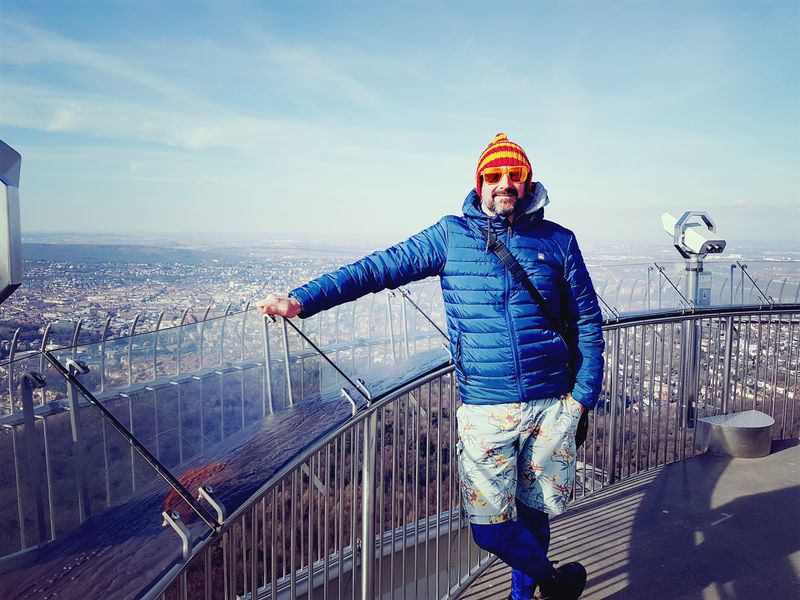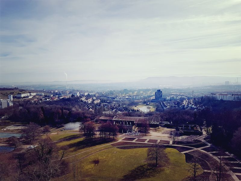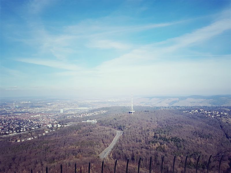 Der 217 m hohe Fernsehturm war der erste seiner Art, der in Stahlbeton Weise gebaut worden ist. Vor ihm gab es nur Sendeantennen als Stahlgerippe, die von Seilen gehalten wurden. Mittlerweile gibt es Fernsehtürme in ähnlicher Bauweise auf der ganzen Welt. Der sichtbare, also oberirdische, Teil des Turms wiegt knapp 3000 Tonnen. Das Fundament beträgt zusätzlich noch einmal 1500 Tonnen Stahlbeton und eine Erdlast von 3000 Tonnen. Der Aufzug fährt in 36 Sekunden vom Boden bis zur auf 150 m gelegenen Aussichtsplattform. Die Beton-Wandstärke am Korbansatz beträgt lediglich 19 cm. Von der Aussichtsplattform habe ich einen spektakulären Rundumblick über Stuttgart, weit den Neckar runter und bis tief in den Schwarzwald.