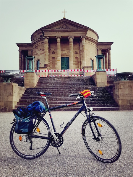 Am Dienstag zieht es mich raus aus der Stadt, so trägt mich mein treues Fahrrad erst am Neckar durch Cannstatt und Untertürkheim, dort geht’s kilometerlang am Motorenwerk von Mercedes entlang. Dann geht’s in die Berge und zwar in die Weinberge, hinauf auf den Württemberg, zur Grabkapelle des württembergischen Herrscherhauses. Schöner Ausblick auf dem Stuttgarter Süden, leider ist es leicht diesig.