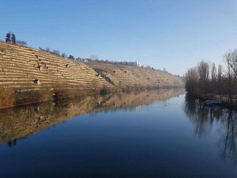 Noch im Freizeitpark queren wir über den Max-Eyth-Steg, eine kleine Fußgängerbrücke zum dritten Mal den Neckar. Auf der Westseite laufen wir dann auf der Austraße Richtung Stuttgart-Münster. Kurz vor Münster unterqueren wir die bekannte Steilhanglage Cannstatter Zuckerle an der 14 Wein Enthusiasten, Wein, den Steiler Zucker anbauen. Auf dem Deich queren wir den kleinsten der Stuttgarter Stadtteile, Stuttgart-Münster. Weiter südlich durchlaufen wir das gigantische Kohlekraftwerk mit seinen zwei Kraftwerksblöcke ebenfalls in Stuttgart-Münster.