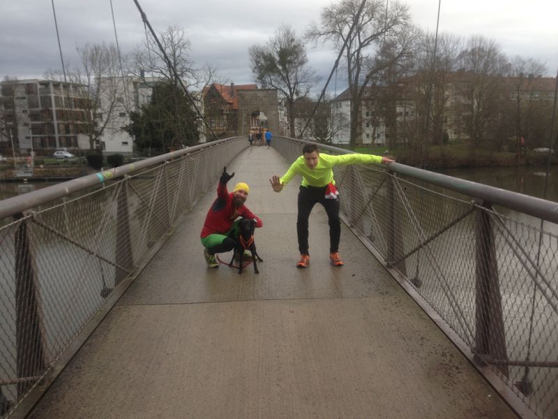 Am 27.12.2017 ging es zu Sylke Kuhn alias Laufwerk Kassel in die nordhessische Metropole. Dort führt uns die 7 Kilometerrunde, die 6 mal zu durchlaufen ist, an beiden Seiten der Fulda über eine sehr abwechslungsreiche Strecke. Nach dem Start wird ein 620 Meter langes Auftaktstück gelaufen, bevor es auf die reguläre Runde geht. Die Strecke führte uns erst auf der Westseite der Fulda auf der Fuldapromenade und dem Auedamm Richtung Norden. Zur Rechten haben wir immer Wasser, zur Linken Bootshäuser, das riesige Auebad oder den Schlosspark, die Karlsaue. Am nördlichsten Punkt der Strecke überquerten wir auf der Drahtbrücke die Fulda. Die Drahtbrücke, deren Drahtsystem an zwei Pylonen aufgehängt ist, wurde am 1. November 1870 dem Fußgängerverkehr übergeben. Die Brückenkonstruktion wurde von Henschel, einem traditionsreichen Kasseler Maschinenbaubetrieb erbaut. Bekannt war dieser für seine Lokomotiven, Flugzeuge, Lastwagen und Omnibusse. Weil die Brücke vorerst in Privatbesitz war, musste bis zum 31. März 1896 jeder bezahlen, der darauf die Fulda überqueren wollte: Fußgänger 3 Pfennig und Reiter 3 Silbergroschen. Seit dem 1. April des gleichen Jahres, als sie zum Eigentum der Stadt überging, ist ihre Überquerung kostenlos. So sparten wir Läufer jeder 18 Pfennige!