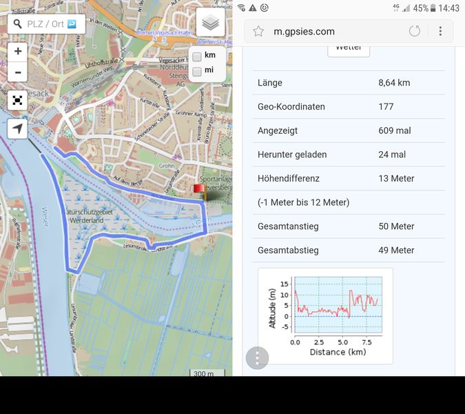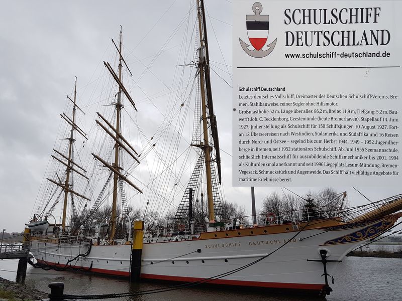 Erst geht es über das Sperrwerk über die Lesum, dann über den Deich an einer Spundwand entlang. Diese erhöht den Deich nochmals, allerdings nur brusthoch, so dass man einen herrlichen Blick zu beiden Seiten hat. An einem Durchgang queren wir Deich und Spundwand und laufen nun im Tiefliegenden, von Zeit zu Zeit überfluteten Naturschutzgebiet im Mündungsdreieck von Weser und Lesum. Dort geht es bis zum Leuchtfeuer auf der Landzunge. An diesem Ende der Pendelstrecke sind wir nur 50 Meter vom anderen Ende der Pendelstrecke entfernt. Allerdings liegen 50 Meter Wasser dazwischen und genau aus diesem Grund kann keine Runde gelaufen werden. Auf dem streckengleichen Rückweg kommt nach der Verpflegung der zweite, kürzere Teil der Pendelstrecke. Hier ist der Höhepunkt das an der Vegesacker Promenade, am Wendepunkt liegende, Segelschulschiff Deutschland. Das 1927 gebaute Schulschiff Deutschland ist ein ehemaliges Segelschulschiff der deutschen Handelsschifffahrt. Das letzte deutsche Vollschiff wurde als Dreimaster gebaut und liegt heute als maritimes Kulturdenkmal ganzjährig in Bremen-Vegesack. Von dort geht es auf gleicher Strecke zurück zum Start/Ziel/Verpflegungspunkt.