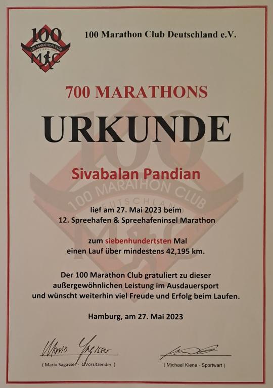Lieber Sivabalan, der 100 Marathon Club Deutschland e.V. gratuliert dir herzlich zu deinem 700. Marathon und wünscht dir weiterhin viel Spaß beim Laufen.