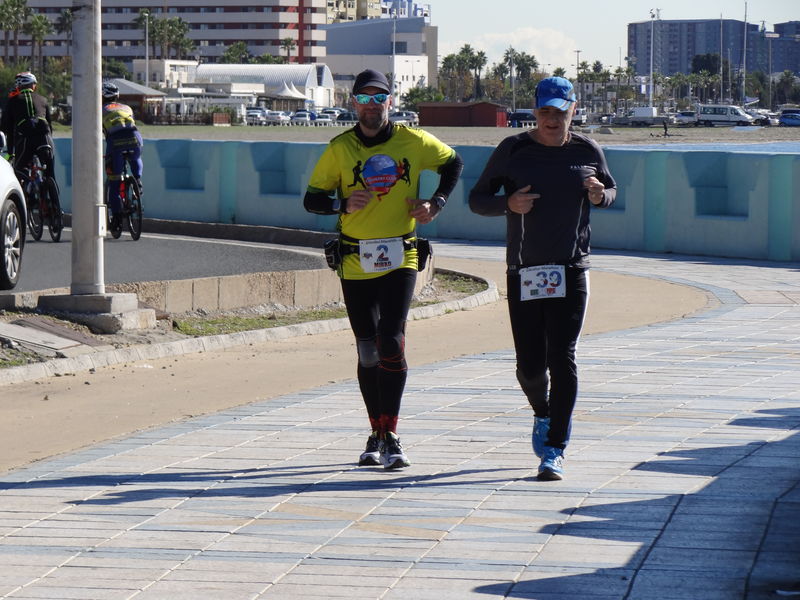 Vor dem Start trugen wir gemeinsam die Verpflegung zum Zielpunkt, der auch als Verpflegungsstand genutzt wurde. Dann ging die Gruppe gemeinsam zum spanisch-gibraltarischen Grenzübergang und weiter zum Startpunkt in Gibraltar. Nach den Startfotos liefen wir 3 km an der Ostküste der Halbinsel in Richtung Straßentunnel, der unter dem Felsen hindurchführt. Als wir am Vortag Gibraltar erkundet hatten, mussten wir feststellen, dass der Tunnel für Fußgänger verboten ist, so dass der Tunneleingang das logische Ende des Auftaktstücks war. Hier drehten wir also um und liefen zurück zum Startpunkt und passierten danach (unter Vorzeigen unserer Ausweise) wieder die Grenze. Welch Vorteil, dass man als Deutscher einen Scheckkarten-großen Personalausweis nutzen kann, der viel einfacher zu transportieren ist, als der Reisepass manchen Mitläufers. Nach 2 weiteren Kilometern erreichten wir dann den Verpflegungspunkt und das erste von insgesamt 8 Pendelstücken begann. Es führte uns auf der Promenade der spanischen Grenzstadt La Linea bei angenehmen (für unsere Verhältnisse spätsommerlichen) Temperaturen und strahlendem Sonnenschein zum Ziel. Der Verpflegungspunkt und die Rundenzählung wurde von Angehörigen der Läufer betreut bzw. durchgeführt. Jürgens Frau war mit dem Fahrrad unterwegs, markierte mit Verkehrskegeln die Wendepunkte, zeigte beim Auftaktstück den Weg an und fuhr später immer wieder die Strecke ab und fragte die Läufer, ob alles in Ordnung wäre. Die Spaziergänger und Radfahrer waren rücksichtsvoll, so dass wir uns komplett auf den Lauf konzentrieren konnten. Auf dem Wasser fand zuerst dasTraining und später auch Wettkämpfe von verschiedenen Ruderbootrennen statt – aber dafür hatte ich erst nach dem Rennen Zeit. Während des Rennens schaute ich immer wieder auf den Weg, um nicht an den wenigen unebenen Stellen zu stolpern oder gar zu stürzen und ich genoß den Ausblick auf den Felsen von Gibraltar, der mich bei jedem Rückweg anlächelte. KLaus Neumann schien der Fels wohl nicht so zu gefallen, denn er fragte (scherzhaft), wieso dieser den Ausblick nach Afrika versperrte.