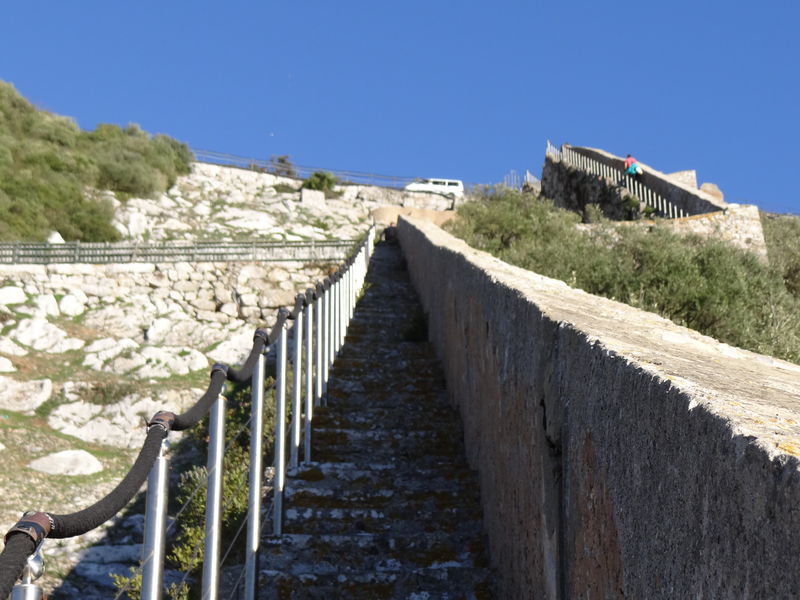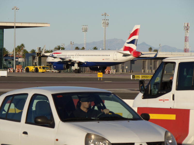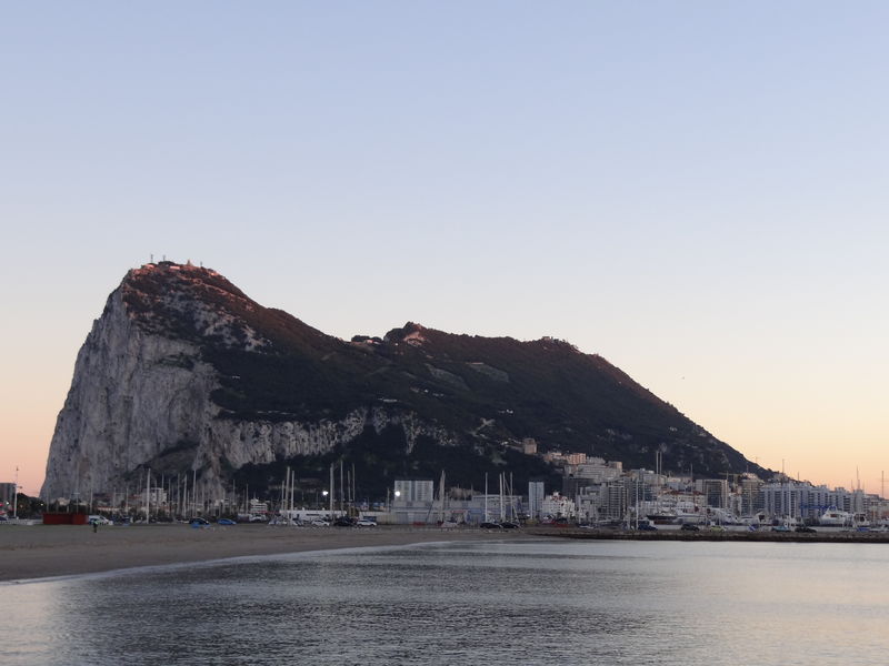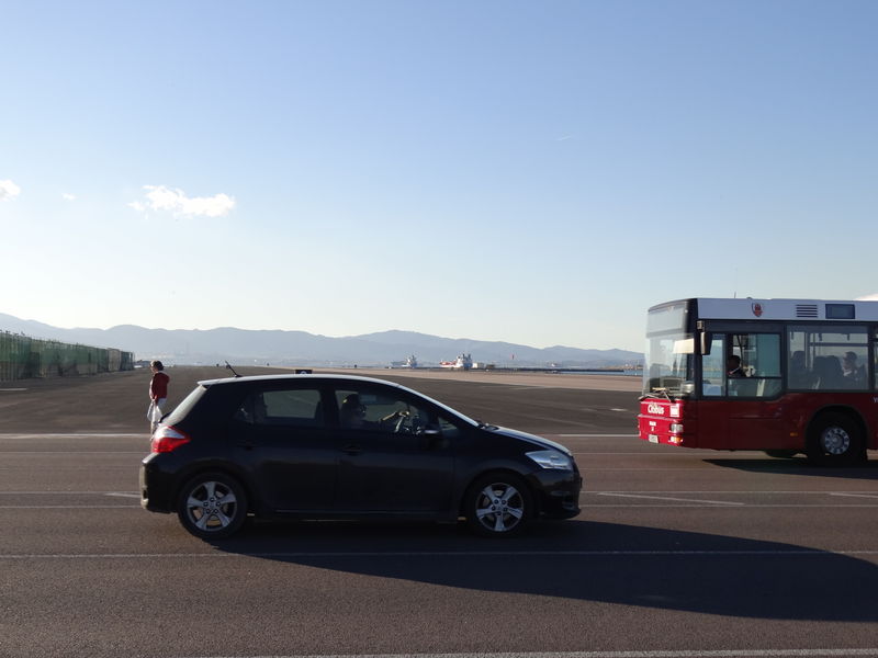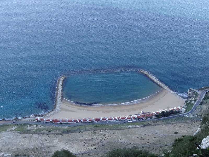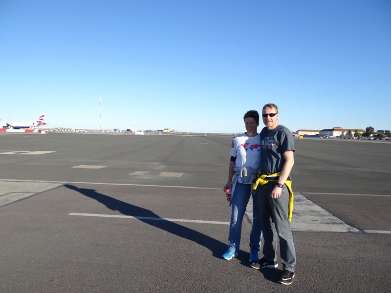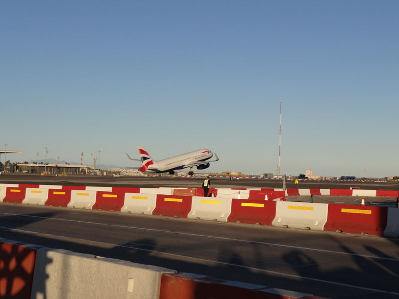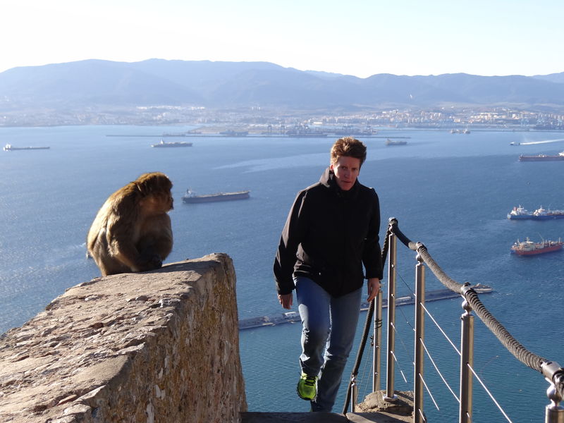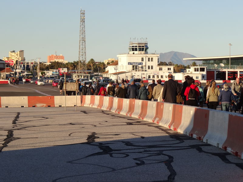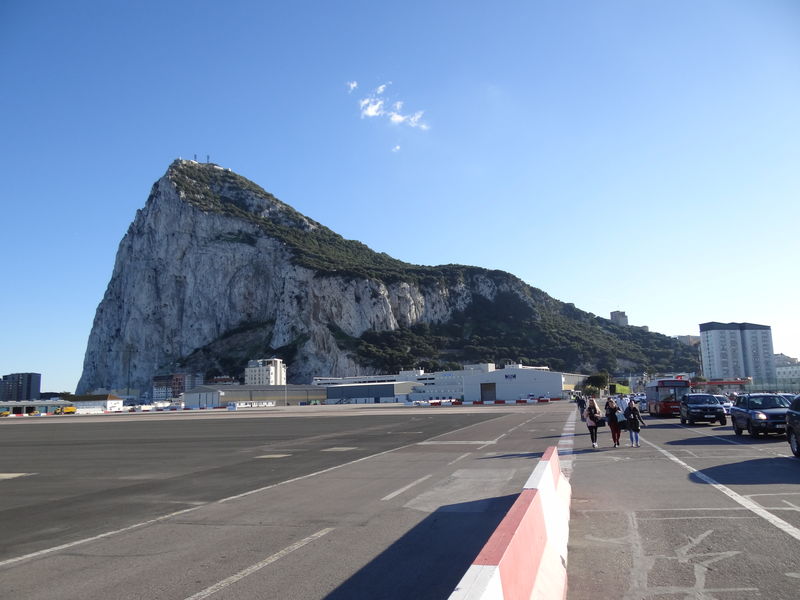 Da Doris und ich am Vortag bereits den Felsen bestiegen und die einzigen in Europa frei lebenden (190) Makaken-Affen sowie den Ausblick auf die (Wasser-) Straße von Gibraltar bewundert hatten, wollten wir an diesem Nachmittag nun den gibraltarischen Flughafen erkunden. Es ist der einzige Flughafen, bei dem eine öffentliche Straße über die Start- und Landebahn führt. Das hat zur Folge, dass links und rechts der Rollbahn Schranken und Polizeiposten stehen, die den Verkehr (Fußgänger, Radfahrer und Fahrzeuge) anhalten, wenn ein Flugzeug startet oder landet. (Die morgendliche Startzeit des Laufs war so gewählt, dass wir ohne Verzögerung dort passieren konnten!) Jetzt bei der Besichtigung hatten wir uns genau die Zeit ausgesucht, als eine Maschine landete. Dann warteten wir bis diese eine knappe Stunde später wieder Richtung London startete. Zwischendurch wurde die Straße kurzzeitig noch ein paarmal für Autos und Fahrräder gesperrt, wenn nämlich Flughafenfahrzeuge auf der Landebahn fuhren, bspw. um die Bahn zu reinigen. Recht kurios. Die in einem Reisebericht genannten Schikanen bei der Einreise nach Spanien haben wir nicht erlebt, offensichtlich hat sich das wieder entspannt. Auch lange Schlangen bei der Ein- und Ausreise mit dem Auto sind uns erspart geblieben.