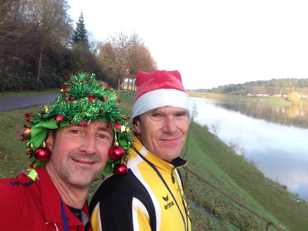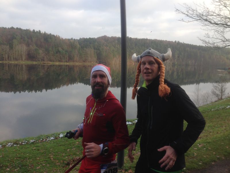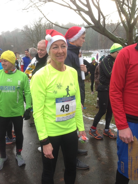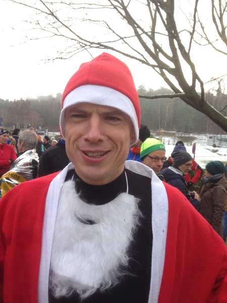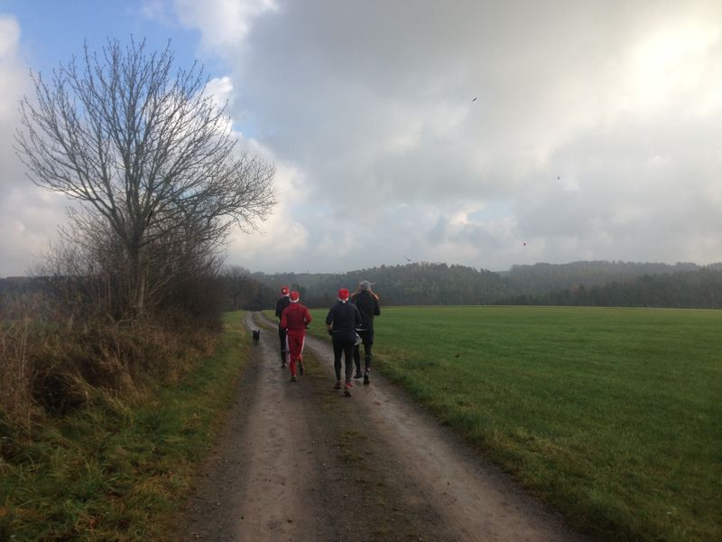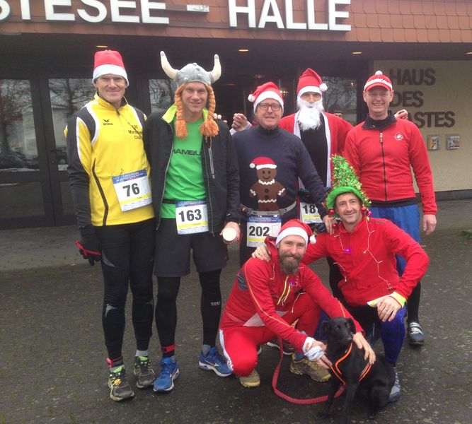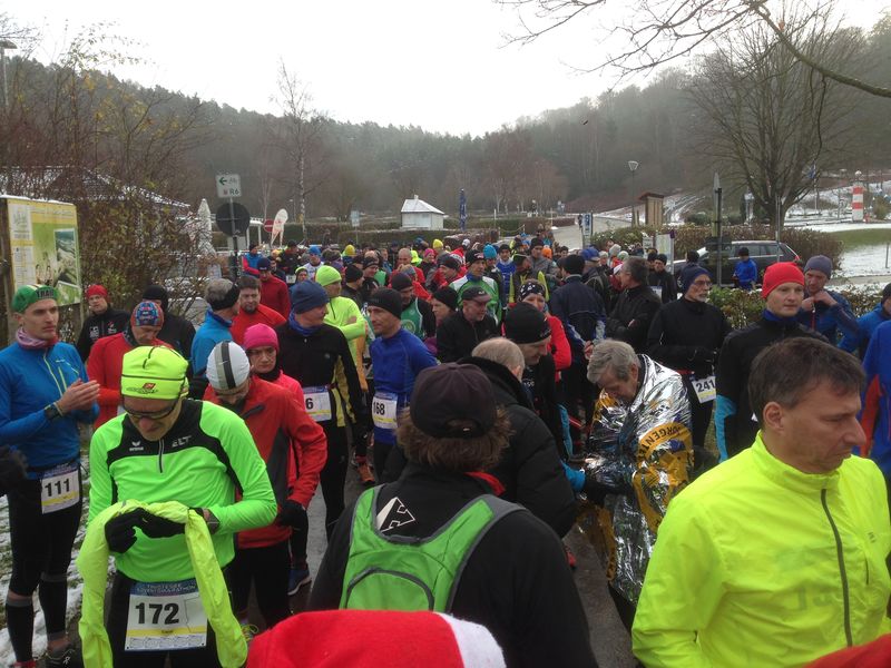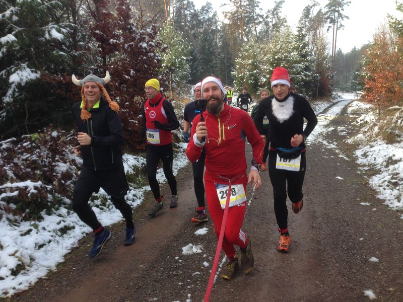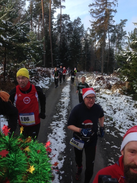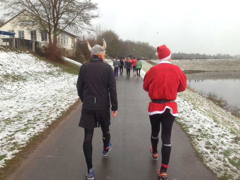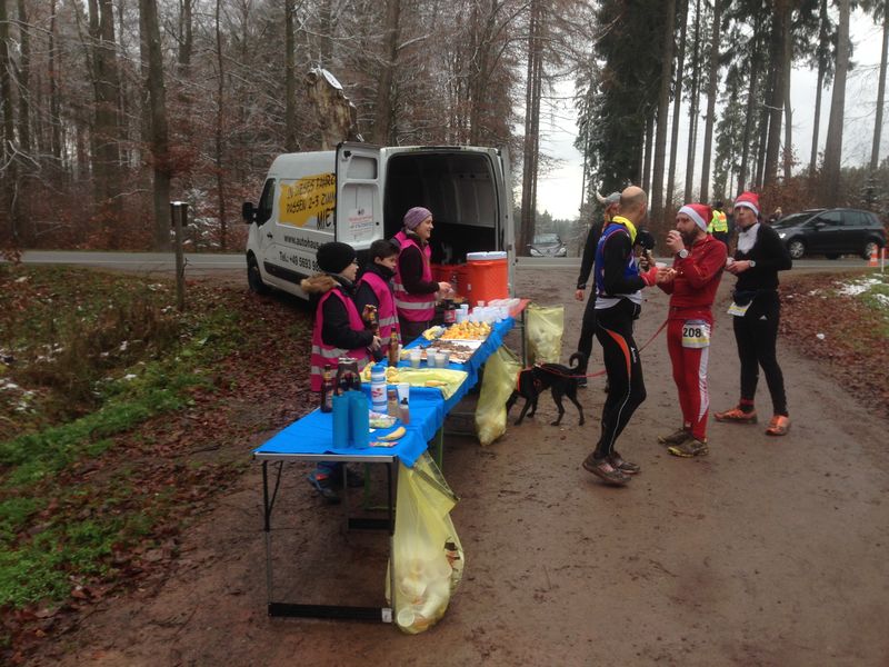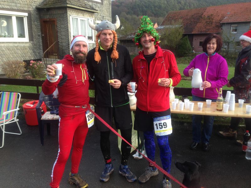 Für 28 Euro Startgeld wird eine große Runde durch den Arolser Wald geboten. Auf den ersten und letzten zwei Kilometern wird auf dem Uferpromenadenweg am Twistesee gelaufen. Dazwischen eine große Runde mit einem kleinen Begegnungsstück auf Feld-, Wald- und Wiesenwegen, die uneingeschränkt mit toller Landschaft punktet. Bei Temperaturen knapp über dem Gefrierpunkt starteten wir im Schnee, der sich in den höheren Lagen auch hält. Im Ziel ist die Weiße Pracht dann aber größtenteils schon wieder geschmolzen. Wie in vielen Jahren auch, sorgten etliche Teilnehmer mit ihrer Jahreszeit typischen Kostümierung für Heiterkeit bei Zuschauern, Helfern und Mitläufern. Verpflegungsstände versorgten alle drei bis fünf Kilometer die Läufer mit allem Notwendigen. Zum Teil auch sehr weihnachtlich mit Lebkuchen, Dominosteinen und Weihnachtsgebäck. Am letzten Verpflegungspunkt gab es dann neben selbstgebackenem Eierlikörkuchen (unglaublich lecker!!!) auch Glühwein. Ein Transponder zur elektronischen Zeitnahme wurde zur Verfügung gestellt. Als Erinnerungspräsent gab es eine mit dem Veranstaltungslogo gestaltete Tasse. Alle Finnisher erhalten im Ziel eine Medaille. Für die Sieger (Einzel und Mannschaft) und einige Helfer gab es riesige Schokoladenfiguren.