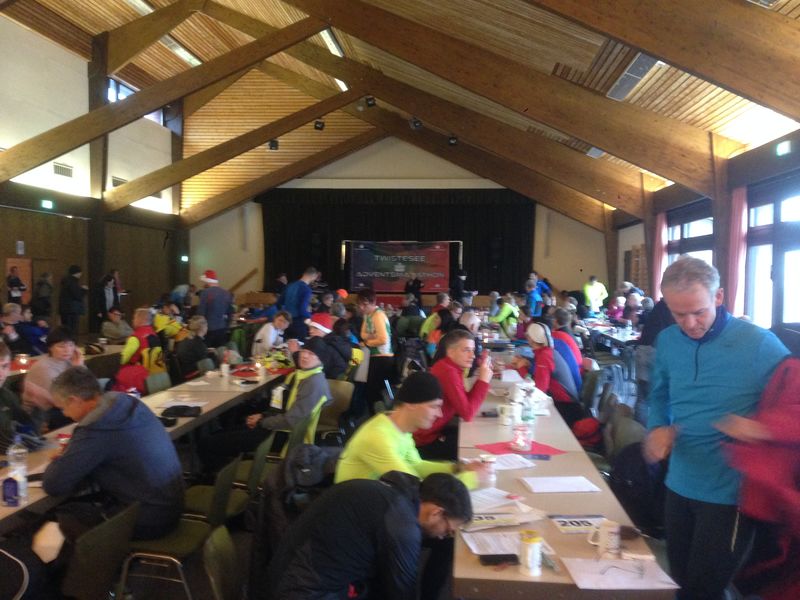 Rund vier Kilometer östlich von Bad Arolsen liegt der Ortsteil Wetterburg. Und hier gibt es tatsächlich mitten im Ort ein großes mittelalterlich anmutendes Fachwerkhaus – die Wetterburg. Heute ein Restaurant, in dem wilde Ritteressen stattfinden. Aber das war nicht unser Ziel am Samstag, den 02.Dezember 2017. Wir wollten zur Twisteseehalle, dem organisatorischen und logistischen Zentrum des Marathons. In der 1984 eingeweihten Twisteseehalle befindet sich das Wettkampfbüro, die Startnummernausgabe, Umkleidebereich und der Gastronomiebereich. Parkplätze stehen vor und um die Halle zur Verfügung.